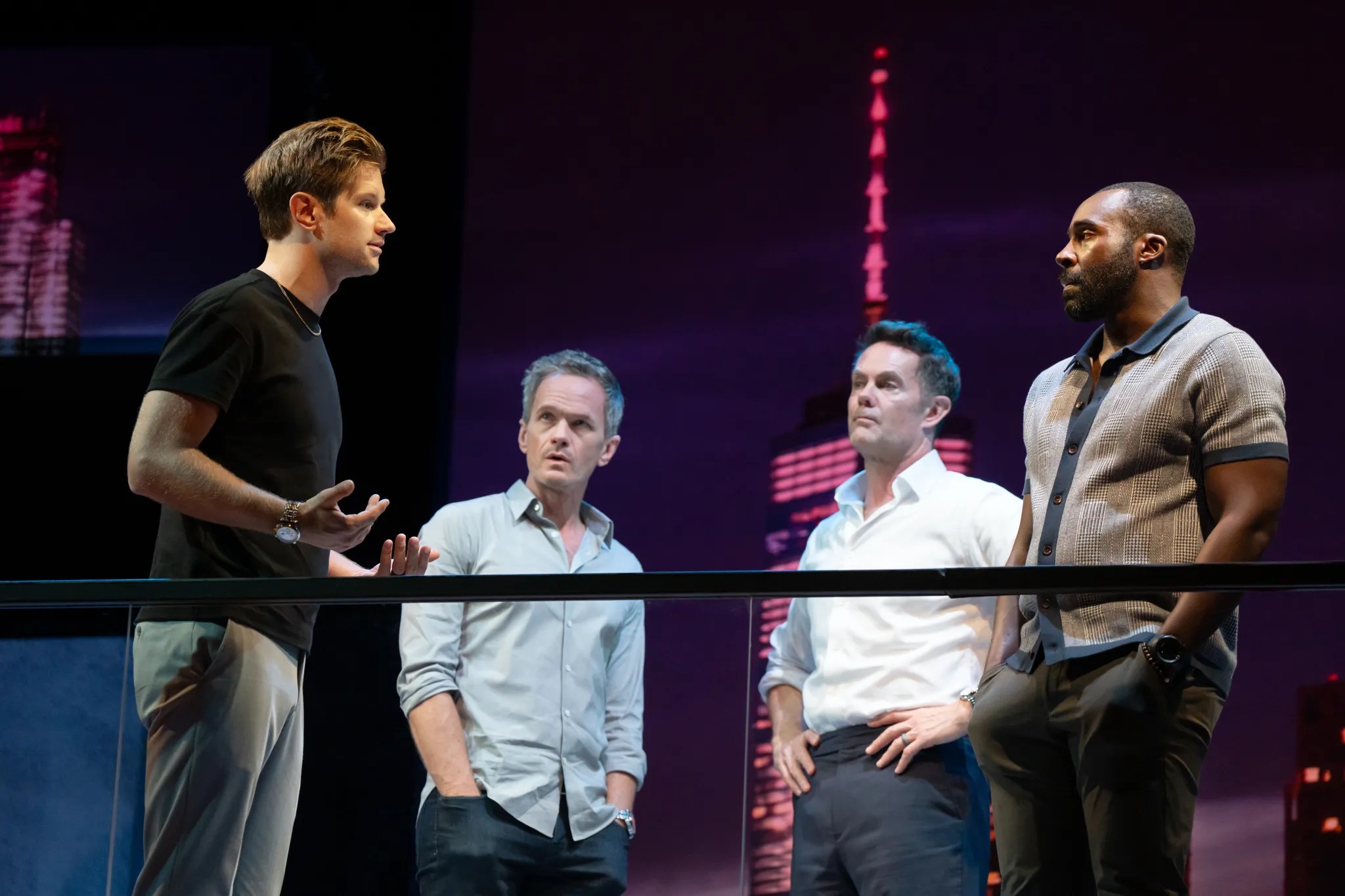 “Let’s play a game,” she says to their gaggle of friends with a casual giddiness that in a way feels true, but also contains an edge that feels sly and seditious. But will they actually do this? Because the idea is somewhat crazy, and even we know the game is a dangerous one, sure to light a few uncontrollable flames in their furnaces. That’s a basic premise of MCC Theater‘s intoxicatingly fierce and funny Shit. Meet. Fan. now getting a starry off-Broadway run that is sure to raise a few eyebrows. Based loosely on Paolo Genovese’s 2016 Italian film “Perfect Strangers“, they make their way, mostly two by two, into the lux livingroom of the hosting couple, played to brittle perfection by Neil Patrick Harris (Broadway’s Hedwig…) and Jane Krakowski (Broadway’s She Loves Me).