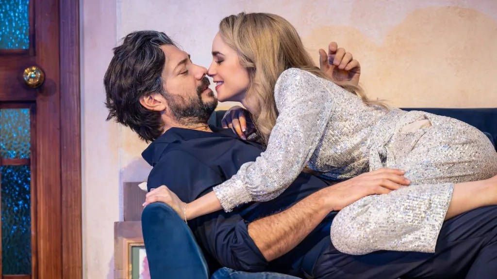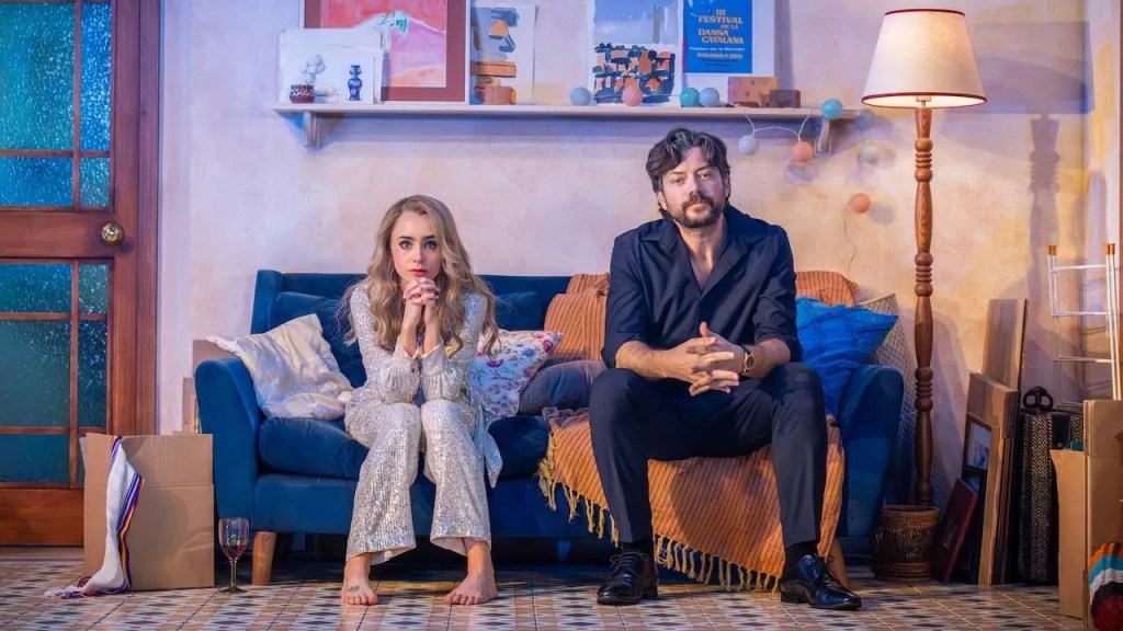 It becomes quite clear that Manuel, played handsomely by Álvaro Morte (Netflix’s “Money Heist“), and Irene, intoxicatingly well-portrayed by Lily Collins (Netflix’s “Emily in Paris“), don’t really know one another, beyond a few simple facts ascertained by quick conversations this very night. I’m not even sure that Manuel, a name that doesn’t quite stick in Irene’s foggy head, likes the drunk American woman, who finds a way to say all the wrong things in just the right order, along with a quick dig at “boring” Canadians (that made this Canadian smile). She’s lost a shoe, or at least she thinks she has, after throwing it at Manuel’s head when he tried to leave the bar she was partying in with her annoying girlfriends. It’s a bachelorette party, you see, in from Texas, to partake in some sangria and tapas, but this glittery gal, dressed well by costume and set designer Frankie Bradshaw (Donmar/West End’s Sweat), is an annoyingly giggle “proud American” for no apparent reason other than she says so. And in this somewhat compelling interval-free 90-minute play, Manuel has no problem flipping her statements back at her with precision as Irene navigates her own existential crisis alongside Manuel’s own guilty conscious.