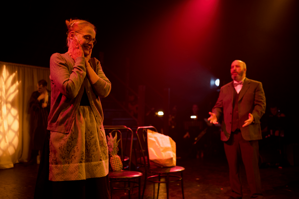 The sinister darkness isn’t always as prevalent as the music and the band, particularly when Germany’s history is unveiled and unmasked center stage to a few surprising gasps from the audience. But I also don’t recall ever being so pleasantly surprised by any off-Broadway staged rendition of Cabaret. Horrowshow Productions has certainly delivered a determined and entertainingly strong Cabaret with a clear emotional undercurrent to be reconned with, particularly when it becomes clear that “Tomorrow Belongs to..” them, and not to the sweet Fräulein Schneider, tenderly portrayed by Jill Louise Léger and her grocer, Herr Schultz, played by the gentle Cyril Johnston (BurlOak’s Little Shop of Horrors). Their pineapple engagement literally “Couldn’t Please Me More.”
