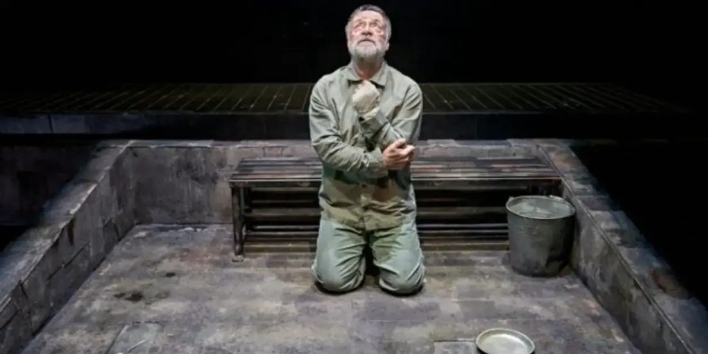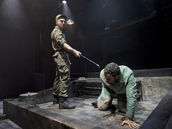 “I went to the seaside,” the man begins, starting a wordplay game to fill the void and to distract the mind. It takes a few beats and tries for the game to make sense, but as we are told, there is “no shame in accepting help.” We lean it to the formulation, attempting to put time and place into the space, like the man, Wallace, portrayed with great attention to detail and nuance by Richard Harrington (West End’s Home, I’m Darling), does with his cutlery and bowls. He is keeping time, yet he has lost his way through it, as pointed out by the other, Valdez, tenderly embodied by Waj Ali (Gate’s Dear Elizabeth). “It’s been two hours,” he tells the surprised Wallace, but it’s hard for the two to actually know for certain, as they have been held captive, in what appears to be a Russian prison for political activism, separated by walls, unseen by the other, and left to only think about what torturous action will be done against them when they are hauled off again by the guard named Smash, powerfully played by an impressive Ross Tomlinson (“This is Going to Hurt“).