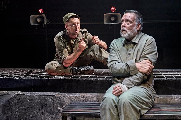 However, the framing of sanity and imprisonment doesn’t stop there in Wright’s fascinatingly dense play. It only resonates more loudly when the loud and fierce prison guard starts engaging verbally, sharing with his two victims, the deepening chasm that is growing inside him between duty and disgust. The trust and duality of the space, designed with clever harsh intent by designer Simon Kenny (West End/Off-Broadway’s Sweeney Todd), made only the more jarring by the lighting design of Anna Watson (Donmar’s The Band’s Visit) joined with the jolting sound design of Mike Walker (Fortune’s Operation Mincemeat). It strikes hard at our senses and our own resistance, drawing us into the door opening and making us shiver in its coldness and dangerous contemplations. “Go, fuck-face,” they are told. “Bloody go!,” but the freezing of their framing means something far greater than the hope and fantasy that came before it. They have now become prisoners of their own empathy and mistrust, and the walls close in around them all.