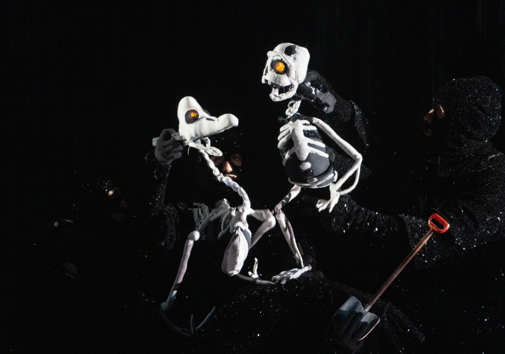“Everything is dead now”, we are told, but two skeletal companions; a dodo and a boy who’s missing a few pieces, look out for one another as they search and dig for fresh bones for the skeleton boy. They sing lovingly and joyfully of friendship and compassion, as they witness the deterioration of their skeleton forms, hoping against all hope to find the missing pieces that will make the boy whole again. Written and directed within clever formulations by Gwendolyn Warnock and puppet designer Kirjan Waage, with collaborative help from the ensemble (Sigurd Axelsen Rosenberg, Alexandra Bråss, Dorothy James, Andy Manjuck, Hanna Muir, Peter Russo, Anna Serine Soland, Marie Skogvang Stork), the boy leads us through, bravely, but frightened by the idea of disappearing forever if he doesn’t replace the limbs that he has lost, but their friendship remains true and strong regardless of how doomed they feel. And the feeling enters into our collective soul, and we can’t help but lean into the action, and root for the two to come out on top.