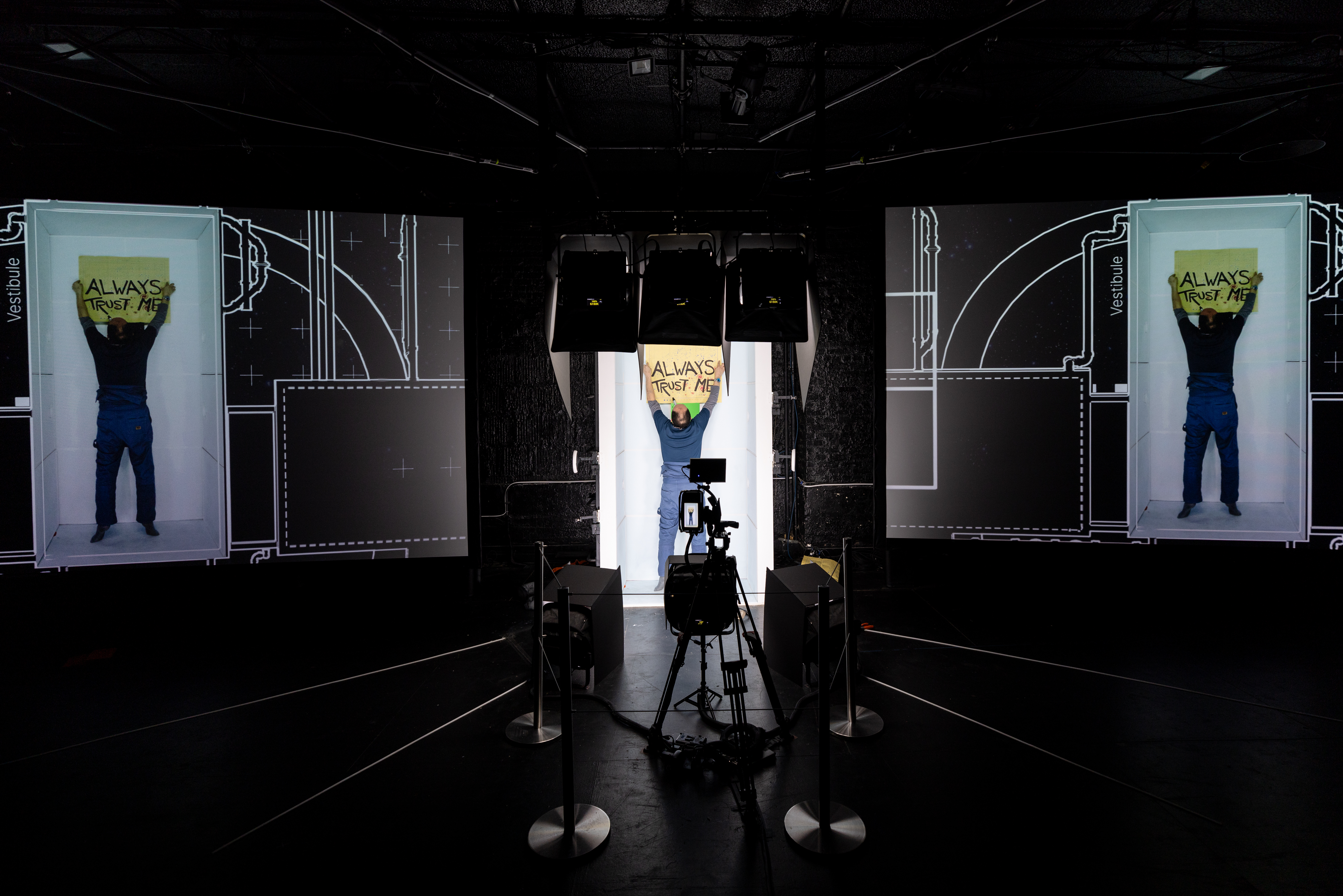 After his craft gets hit by a small “lima bean” sized chunk of interstellar debris, he must find a way to save himself from what’s going on inside and out of his damaged proverbial closet ship, all by himself, with “all those horrible people” that are popping up all around him. The production is technically ambitious and fascinating, backed by some pretty compelling original music & sound designed by Florian Staab (Irish Rep’s On Beckett / In Screen). But it is in the scenic and costume design, crafted by Peiyi Wong (TFANA/Woolly Mammoth’s Public Obscenities), alongside the lighting design by Marika Kent (Arena’s POTUS) and video design by Jesse Garrison (Automata’s The Woods), where the magic is truly electrified and layered on top of one another, with the singular space adventurer flying solidly out and crawling himself back in only to run into himself deliciously again and again, all to delight in. Should he trust those time vortex versions of himself? Or should he stay alert and wary of the frying pan problem? That is the dilemma, and inside that closet spaceship so expertly captured digitally for projection and refraction, Egon Tichy must find his way through the wisecracking aloneness and crowded self-sabotaging environment he has created for himself, knowing full well that this is a two-man repair job, and those others are only himself trapped in the same time loop, as anxious and mistrusting as himself. Each of them knows only a little bit of the future, but not the whole story. What’s one to do?
