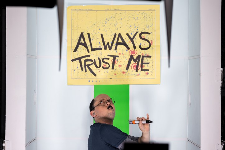 During the days of the pandemic, I streamed a similar version on their YouTube channel, but now, for the Under the Radar Festival and our ultimate viewing pleasure, director Levin, playwright Luxenberg, and performer Gelb, have rewritten, expanded, and reconceived this Voyage into a whole new formulation. It’s a behind-the-scenes exposure that elevates the craftmanship of this unique in-person theatrical experience, giving us insight into the chaotic creation that is now being presented at New York Theatre Workshop’s Fourth Street Theatre (83 East 4th St, Manhattan) and extended, by popular demand, until February 2nd, 2025.