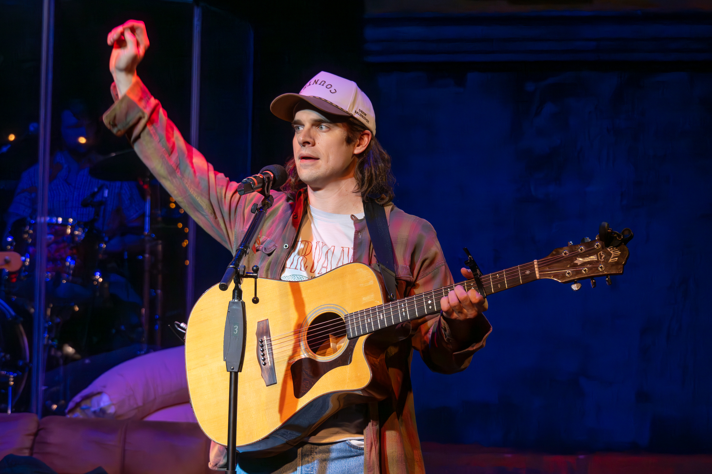 The stage at the West End Theatre UWS, NYC is being warmed up with some surprisingly strong singers participating in an open mic that I originally thought might be a bit more like sitting through a Kareoki night out with some friends who should not be handed a microphone (I’m at the top of that list, tbh). Still, the brave souls that got up on that well-laid out stage, designed authentically and immersively by Clifton Chadick (Ballet Arizona’s Moving Movies), were so good I thought they might be part of the show. One was, obviously, playing his well-crafted role from the show, but the father and future-possible son-in-law, who arrived at the show with his own guitar, I truly believe were just spectators, like me, and now super fans of Bedlam‘s solidly written, performed, and produced Music City. Guided through the paces by a very appealing man-with-a-clipboard, drummer Drew Bastian (TFANA’s Measure for Measure), his “What’s up, Nashville?!” really brought the space out from behind the Jiffy Lube to the center stage at The Wicked Tickle, a country western bar with an ongoing open mic night that delivers.