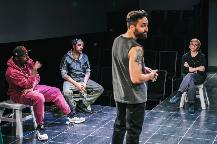 Dressed in perfectly conceived costumes by Laura Delchiaro (Coal Mine’s The Sound Inside), they attempt to take on this wild cat, while also trying to hold onto their own. They run with her, battle her, dismiss her, and try, foolhardily, to tame her. Standouts in this tight group of solid professionals are the multi-role playing caregiver and caretaker, Reid, who is thick with understanding, patience, and empathy two-thirds of the play, until that last character and scene, that annihilates the room while also maintaining a logical understanding of motive and need. Also fantastic is the fellow rehab patient, Mark, played by the ever so talented Ghajar, who takes us on a journey with him from chaos to being a holder of the faith and a caretaker of the rule book.