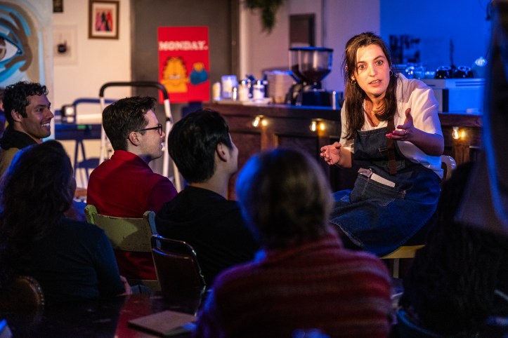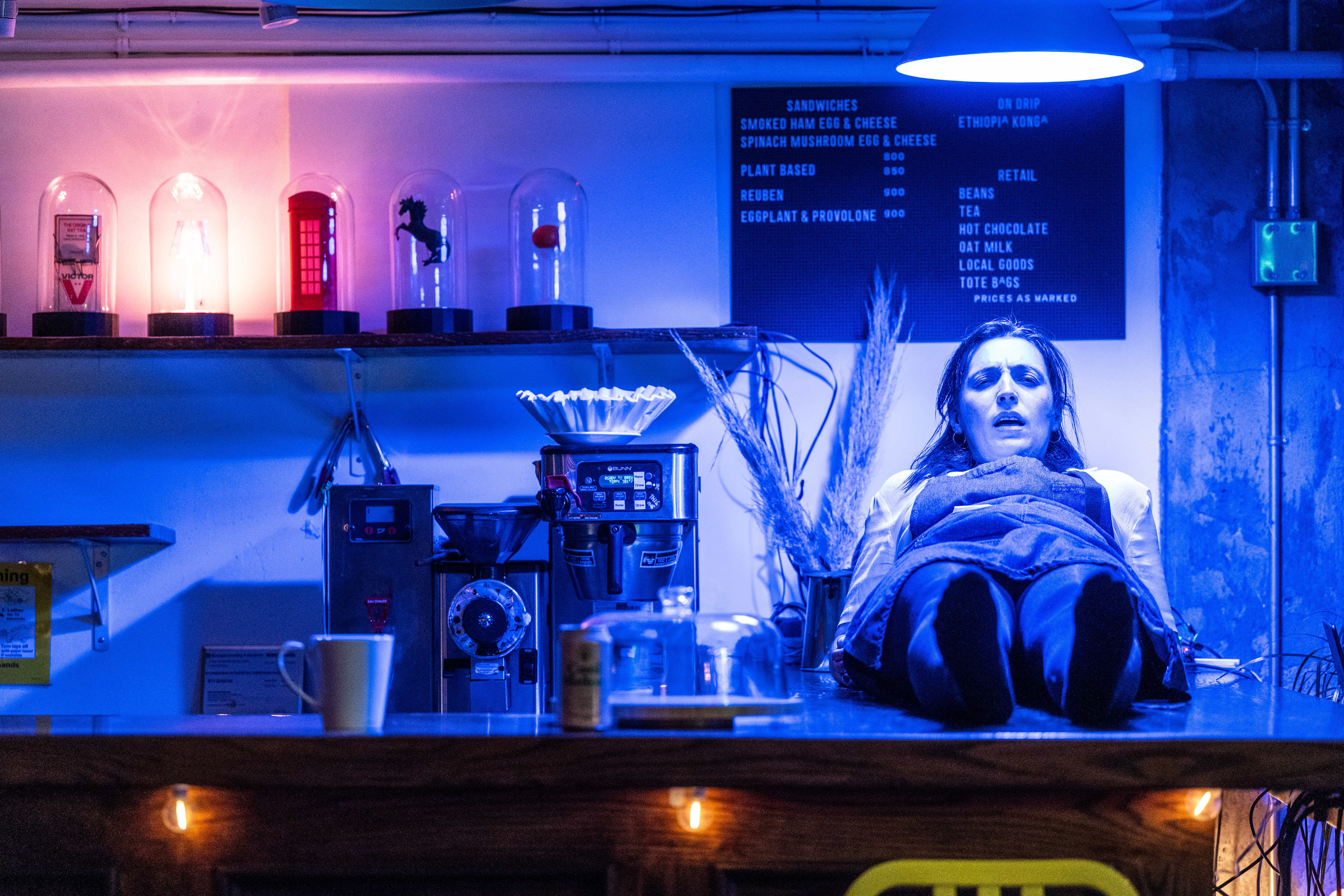 Walking down the quiet streets of Toronto, looking for the entrance to the Dundas West’s Morning Parade coffee bar where Outside the March, one of Canada’s leading site-specific immersive theatre companies, has staged their one-person show, Performance Review. It’s a sweet, cozy space, overflowing with an eclectic assortment of chairs and an even more eclectic assortment of books, scattered about, like Virginia Woolf’s “A Room of One’s Own” and Phoebe Waller-Bridge’s “Fleabag“. We are encouraged (by the most lovely crew of people: BO/FOH manager, Claire Jarvis, and audience concierges Sébastien Heins & Amy Keating) to read and wonder about their relevance, with no real idea how significant this space truly is to the talented and mesmerizing artist that has drawn us all here.
