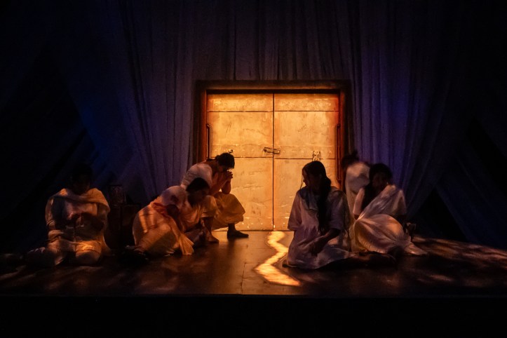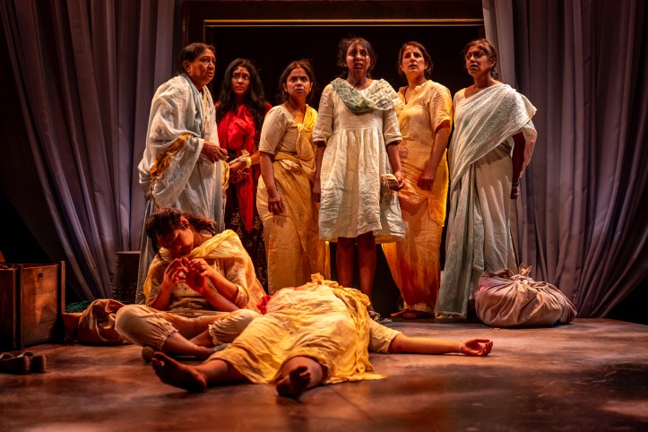 The air was filled with screams and horrors, coming from communal riots, massacres, and sexual violence, with women and children murdered or left traumatized beyond our wildest dreams. This is the theatrical framing, packed tightly into the back of a truck, as Trident Moon, the powerful and emotionally devastating play by playwright Anusree Roy (Brothel #9, Letters to my Grandma) gets underway. It’s not going to be a joyride, this 90-minute play, as the truck shifts into gear as it drives its way through the bumpy, dangerous roads, hoping to arrive at the newly created India. Safety is what waits for those Hindu women, but not for the others, as the play forcibly grabs hold of our throats, like a piece of raw rope pulled tight, keeping us tuned in and activated effectively by the desperation and trauma that was caused by that blood-stained divide.