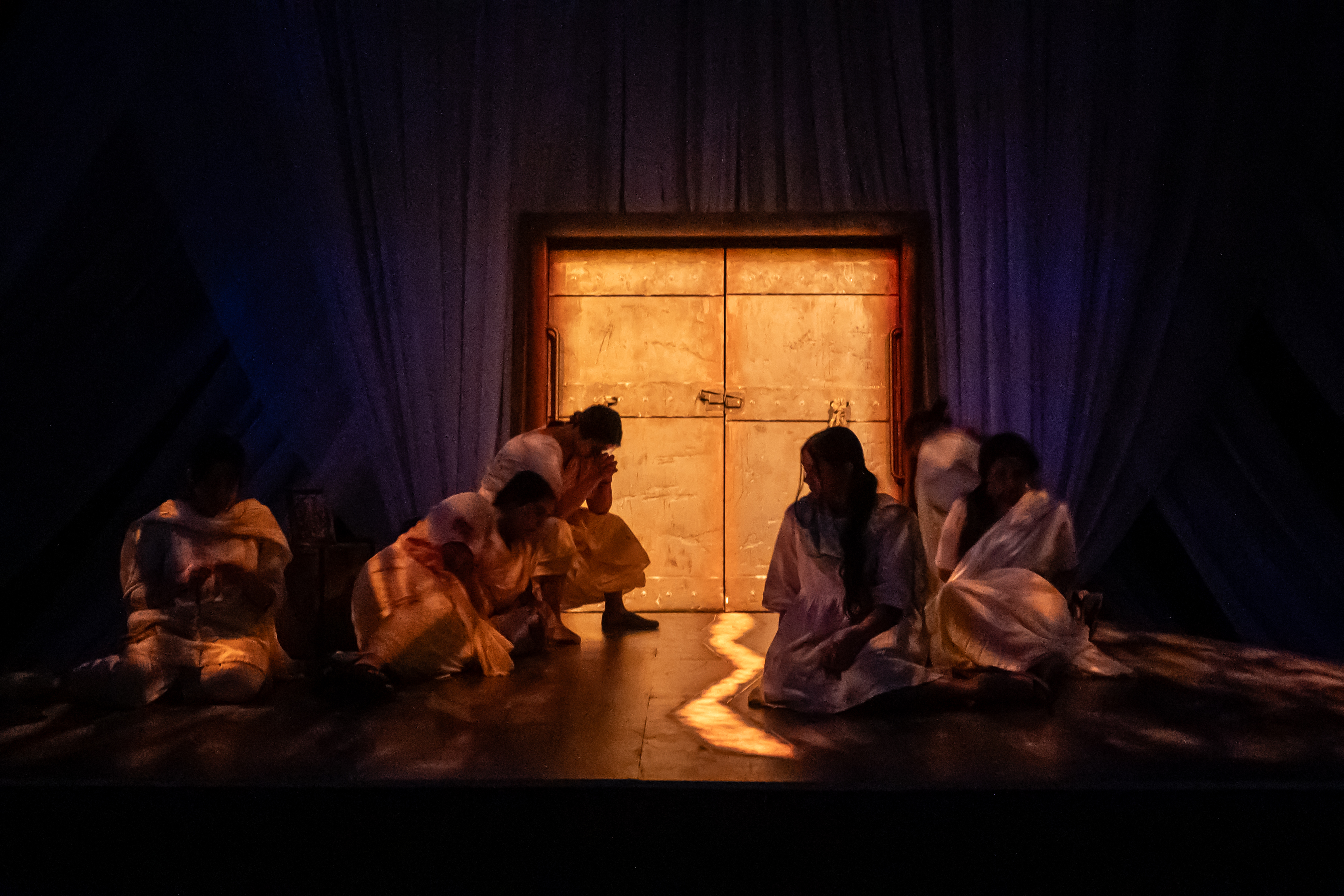 A group of women, both scared and determined, are huddled on each side of that red line, wanting salvation, but deeply afraid of the chaos that burns and fires into the skies outside. No space feels safe for these women. Not inside with each other, nor outside. Hindu women are jumping or being thrown to death down wells, pushed by their relatives by the hundreds (or more). Rape and murder litter the side roads, we are told, as this truck, driven by the brother of one of these Hindu women, hurdles down the road to an idea or concept of safety and security. But only for the three Hindu women on board. The other three are Muslim, known to them all in their earlier life as bosses, but now, they are the abducted, bound by the Hindu women after a brutal attack on the Hindu woman’s husband and son. The violence is real and palpable, described deliberately with detail, and as directed by Nina Lee Aquino (Factory’s The Waltz), for the duration of this gripping fictionalized play, we join them inside this transport truck, feeling their tension and fear as if it’s our own. Without a reprieve in sight.