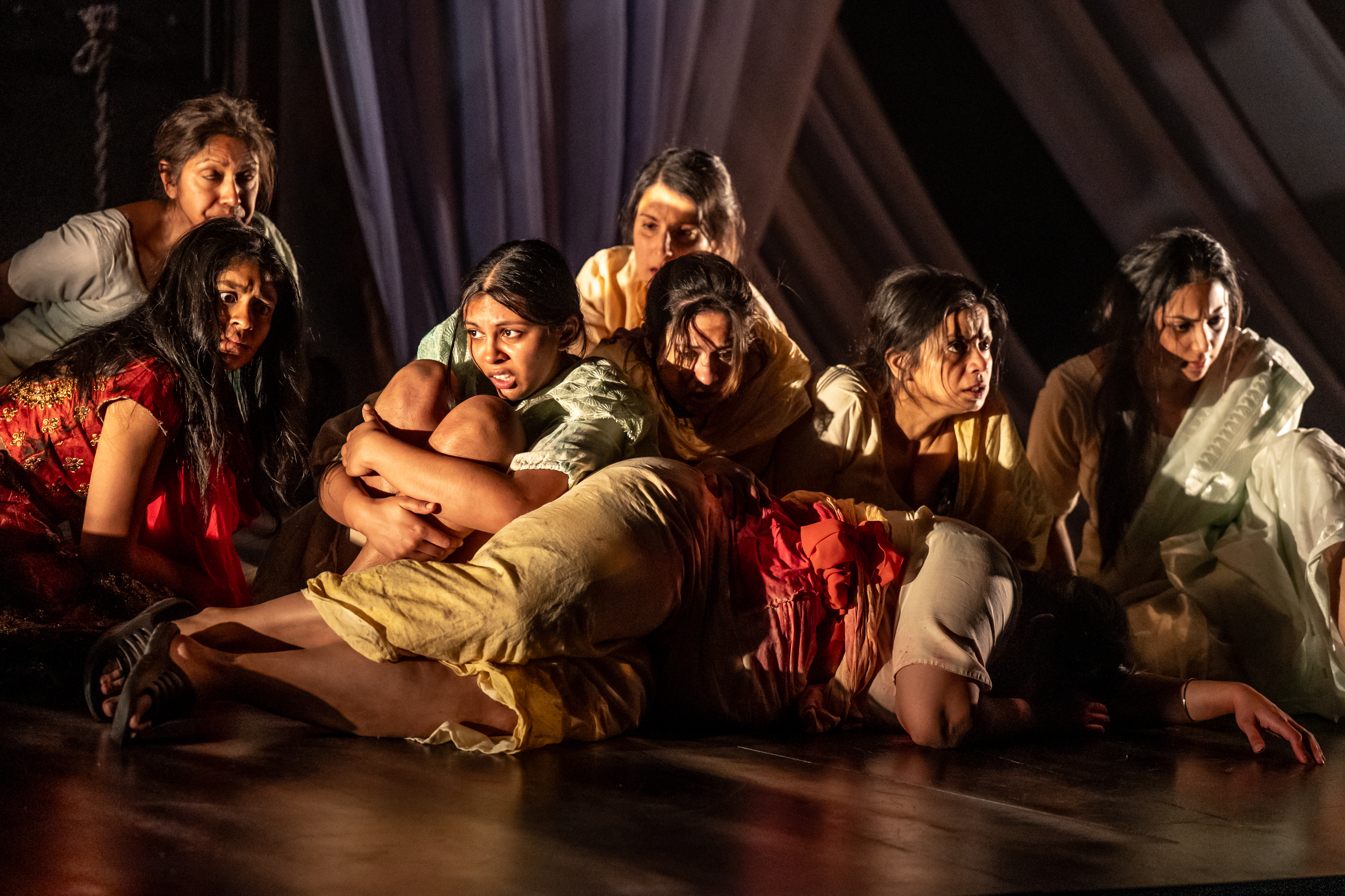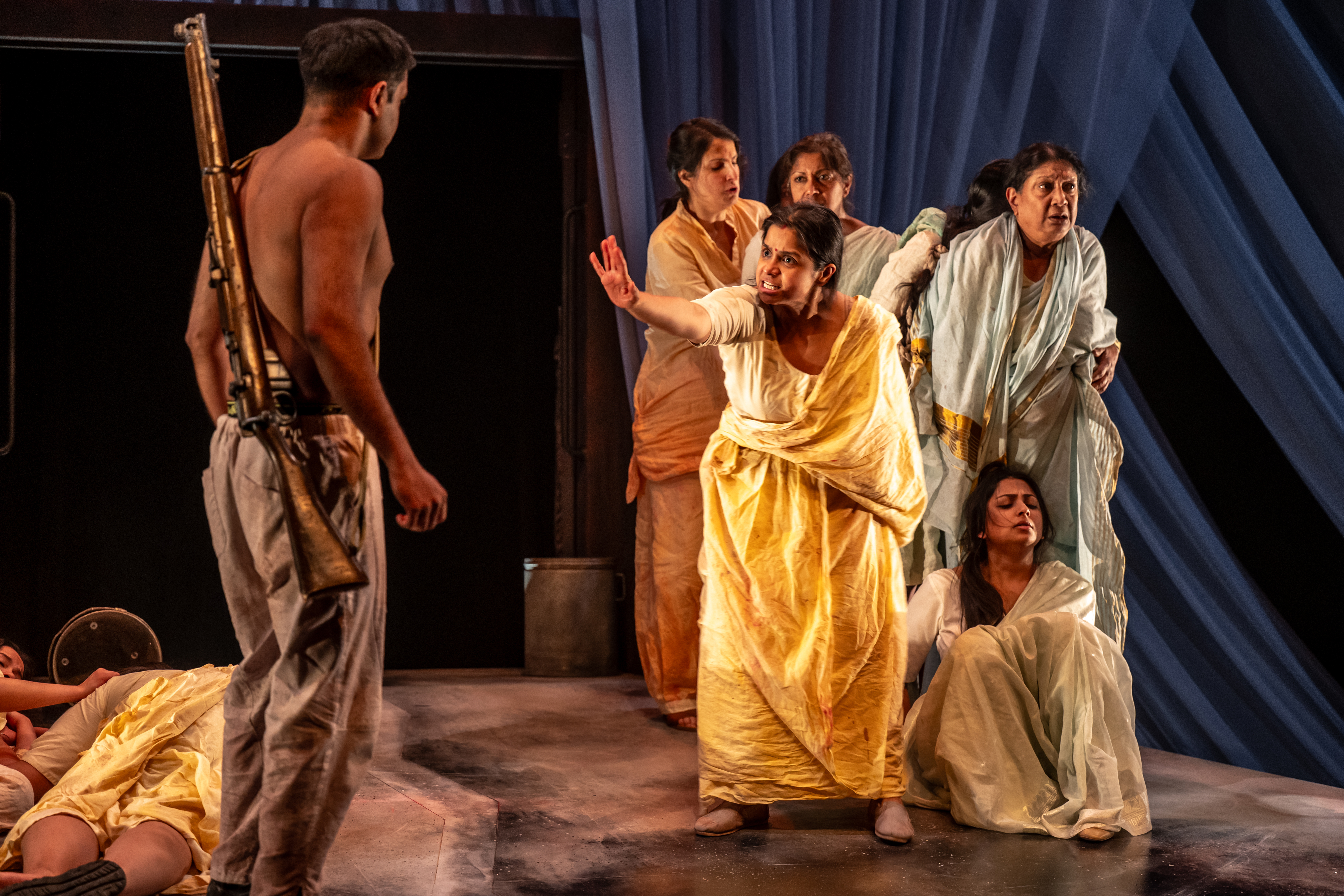 The air was filled with screams and horrors, coming from communal riots, massacres, and sexual violence, with women and children murdered or left traumatized beyond our wildest dreams. This is the theatrical framing, packed tightly into the back of a truck, as Trident Moon, the powerful and emotionally devastating play by playwright Anusree Roy (Brothel #9, Letters to my Grandma) gets underway. It’s not going to be a joyride, this 90-minute play, as the truck shifts into gear as it drives its way through the bumpy, dangerous roads, hoping to arrive at the newly created India. Safety is what waits for those Hindu women, but not for the others, as the play forcibly grabs hold of our throats, like a piece of raw rope pulled tight, keeping us tuned in and activated effectively by the desperation and trauma that was caused by that blood-stained divide.