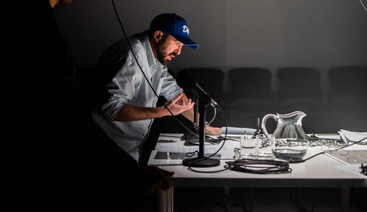 I’m not so sure about the last bit, to be honest, but the rest is certainly all there, played out live for their radio audience (and for us). The reading is determined and well-paced, with all those complex tones that shift somewhat abruptly from comic material to dark psychological drama being delivered in abundance, blending comedy and a tinge of tragedy with ease to fill out the program. But in Manousos’s clever adaptation, the epic and ingenious bipolar qualities of the play are amplified beyond the scripted text and into the finely crafted pauses, ‘backstage’ dynamics, and interval advertisements made by this deliciously game gaggle of actors. The Purity vodka and the sharing of shampoo bottle adverts don’t always pan out as expertly as one might hope for, especially in the lips that lock together in the surprising twist that takes us to intermission. Those framings enliven and excite, mixing and mashing it all up alongside these on and off-air asides and telling looks. Determined to find some parallel symbolic layers in their acting characters, they dig into inside moments and actual text that float out ideas around justice, “morality and mercy“, and the abstract dichotomy and hypocrisy that lives and breathes most clearly inside corruption and purity: “some rise by sin, and some by virtue fall“.