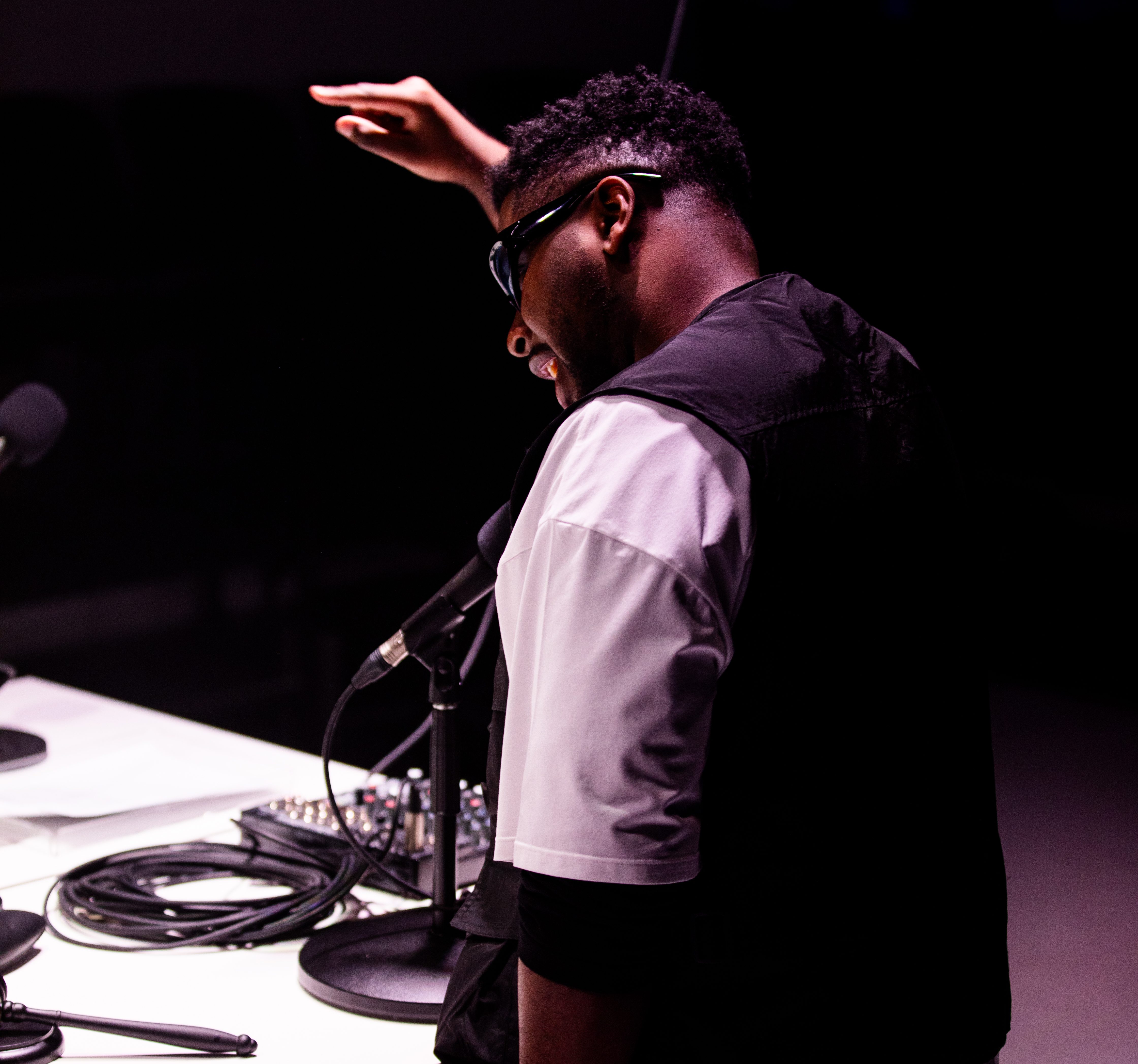 They gather together around a long split white table, filled to overflowing with black sound props and four microphones, wired up to the ceiling for amplification and effect. The crew of five arrives, ushered in by the Sound Tech and Radio host leader, Matthew Graham, played solidly by Danté Prince (Stratford’s Much Ado About Nothing), who will lead them through their radio paces. He gives us the “snap, snap, snap” at the four microphones as the crew of radio actors, played well and clear by a band of fabulously talented stage actors, size each other up and settle in. We see the tension between the actors, played by actors, and we wonder where this electricity is going to lead us. And parallel the Shakespearian tale as Matthew, our radio host, starts it all off with a “here we go…4…3…2…1″.