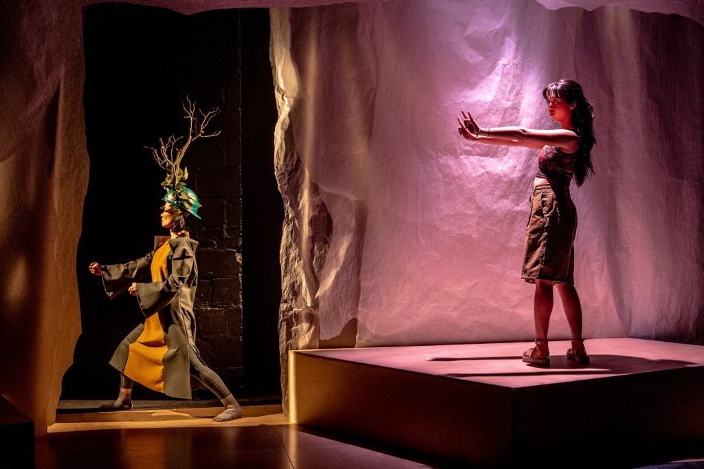 It’s a story of mother/daughter grieving and familial connecting, and as directed and choreographed with a gentle emotional touch by William Yong (RSC’s Comfort), Carried by the River finds magnetic life-altering truth in the easy current memories and fantasies that flow there, spiritually and symbolically, with personified animal guidance arriving when she is in need. At the center of this flowing story is Kai, portrayed strongly and passionately by Honey Pham (fuGEN Theatre’s Kitchen Potluck), a young Asian woman, raised in Canada, who is trying with all her might to find the path of her fire towards a place of acceptance and homeland community. When her mother passes away, an alternate birth story floats to the surface, and she embarks on a transformational odyssey after a particularly (well-executed) bike ride into the river that fails to swallow her up. Another chance for familial enlightenment is presented on the shore, and she digs her heels into the solid ground in an attempt to silence the crying soul and sky.