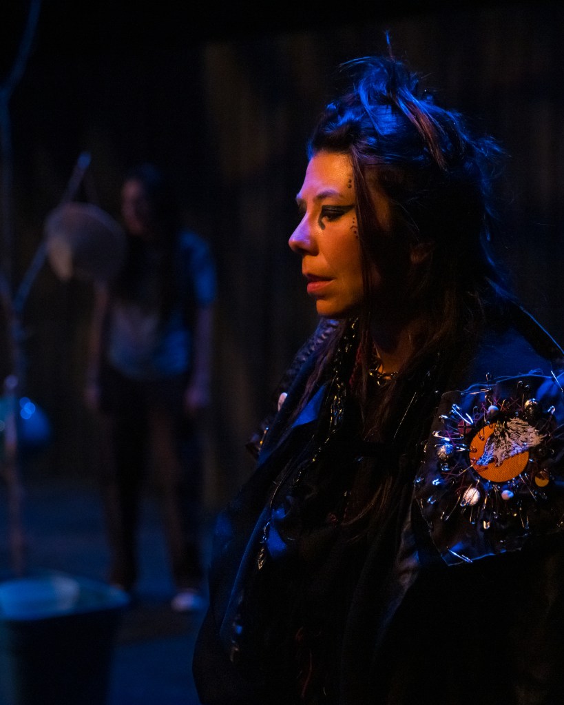 Written with a fantastical mysticism and humor baked in by Caleigh Crow (Hexen), the effect, especially in the first few moments, draws us in with its nervous but caring energy, of a mother, played strongly by Cheri Maracle (Mohawk/Irish; Native Earth’s Women of the Fur Trade), trying her best to engage with her troubled teenage daughter, Beth, portrayed powerfully by the very engaged Tara Sky (Haisla/Settler; Stratford’s Les Belles-Soeurs). Their connection crackles like rebellious static, but the care is clear and subtle, and the space as nurturing to humanity as it is to Beth. Yet what draws us in even deeper is the shocking mythical mutterings of a determined crow, played with full intent by Madison Walsh (Coal Mine’s Killer Joe), who has a lot to say to the fury that lives inside this young woman, and in that reveal, theatrical magic is delivered.