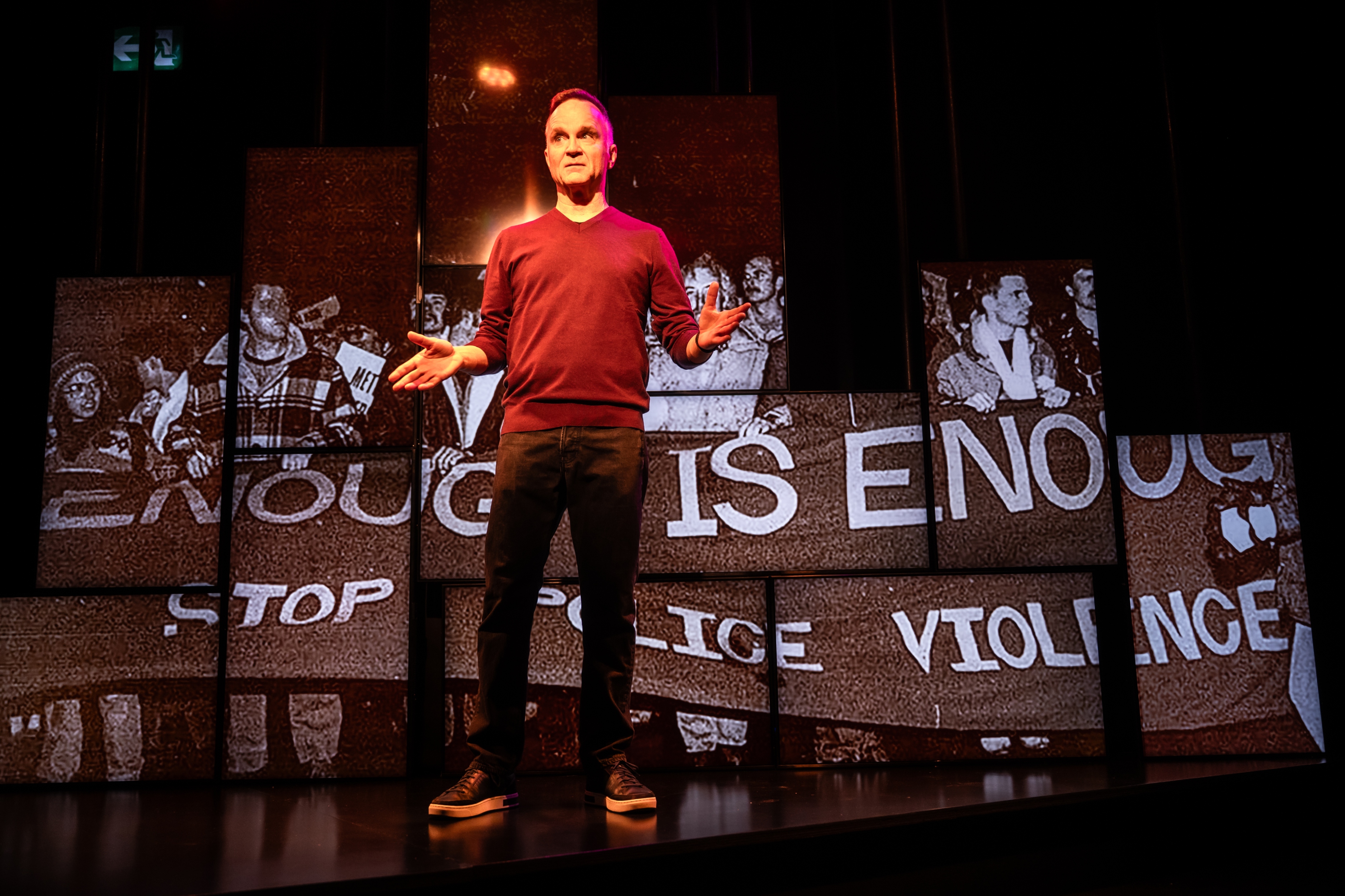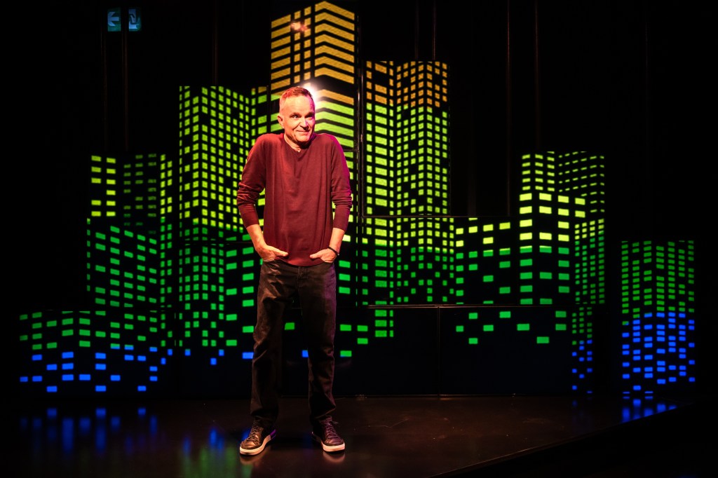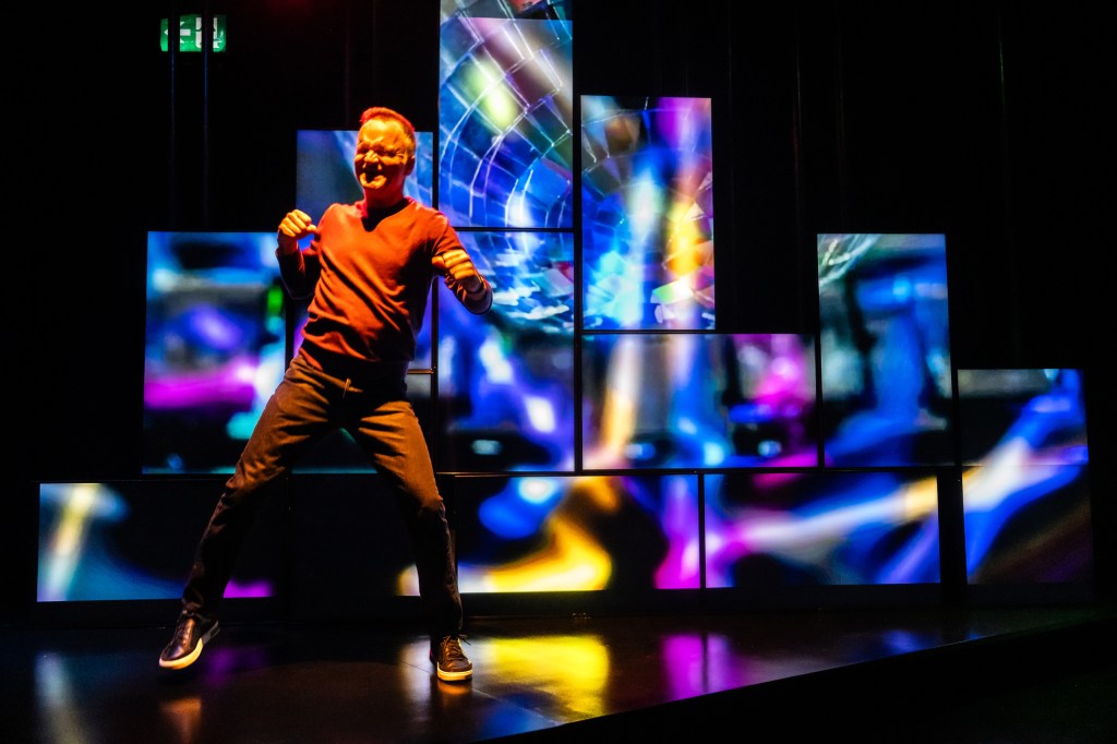 Feeling both flattered and insulted at the same time, Jonathan Wilson (My Own Private Oshawa), writer and performer of Studio 180 Theatre‘s A Public Display of Affection, makes his way to center stage to take on the role of “Queer Elder” in a faux-speech presentation to promote “Queer joy.” It’s a warm and engaging proclamation, filled with love and affection, digging into the Queer history of Toronto starting off in the year 1979. He’s a Queer archelogoist artifact, pulling up rememberences from deep inside that pay homage to and honor some of those he loved, in his own youthful and complicated ways, that aren’t around to tell their stories anymore. It’s an admirable snapshot, made easy by the set & projections designed by Denyse Karn (Stratford’s To Kill a Mockingbird) with determined lighting by André du Toit (Soulpepper’s Three Sisters) and a solid sound design by Lyon Smith (Factory’s The Waltz), that unpacks the random voices that lurk around in the dark, speaking words to someone you just met over an anonymous phone line (before the days of chatrooms and apps), so that you feel somewhat seen, heard, and not so alone in this wild wild world on Toronto’s Yonge Street, the new frontier for Queer exploration and pride.