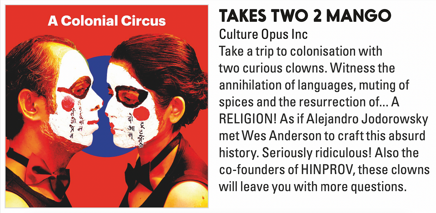 Sachin Sharma and Shreya Parashar, the electrifying comedy duo behind Two.2.Mango, are proud to announce their award-winning clown show Colonial Circus will tour four Canadian cities this year, including performances at the Newfoundland and Labrador Sketch Fest in May, Montreal Fringe in June, Edmonton Fringe in August, and Native Earth’s Aki Studio in September. Colonial Circus was named Critic’s Choice for Best Comedy at Orlando Fringe’s FestN4 2025 and received the Spirit of the Fringe Artists’ Choice Award at Toronto Fringe 2024.