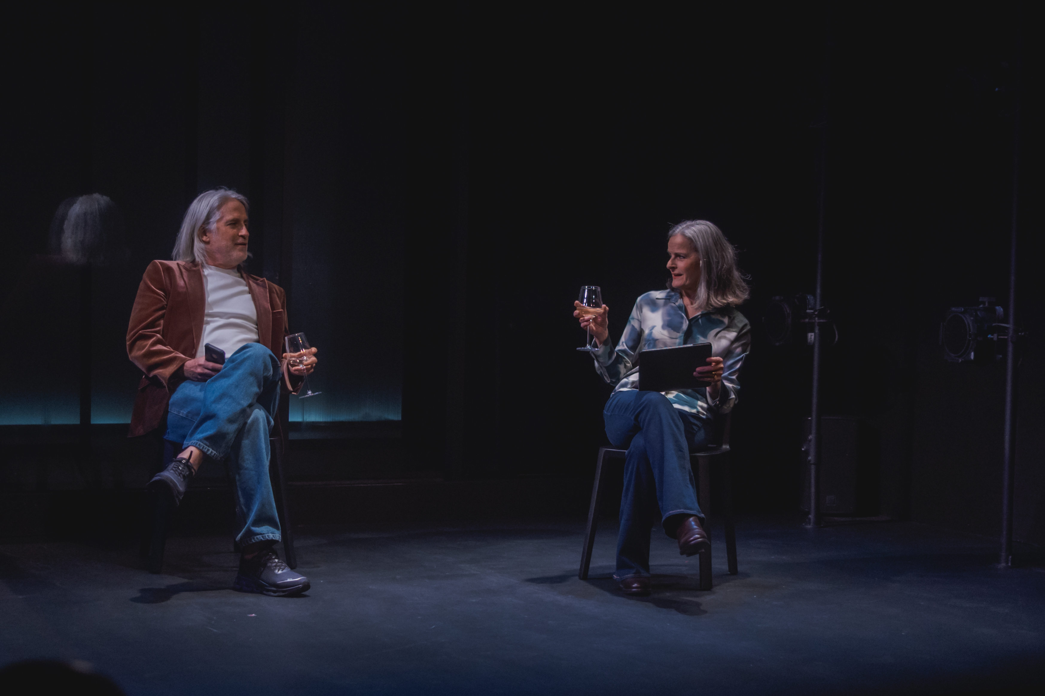 Mark and Julia, as portrayed with exacting purpose by Rick Roberts (Stratford’s The Goat, or Who is Sylvia?) and Tamsin Kelsey (CS’s The Other Place), seem to have it all together. Their marriage is presented as solid, although maybe the sky around them is really too blue for them to notice how out of whack they seem to be. That is until the plane takes off, the snow starts to fall in Rome, the fires take over their weekend mountain retreat, and the torrential rains come down flooding the basement of what once felt like their safe, nostalgic home, filled with adult kids who don’t seem to be, either there or very connected, swimming like mad in their own separation and anxiety. That’s when things start to crack and disconnect in the world around them, maybe similarly to their inside technology-obsessed sanctuaries, where the air is always controlled to be perfect and light.