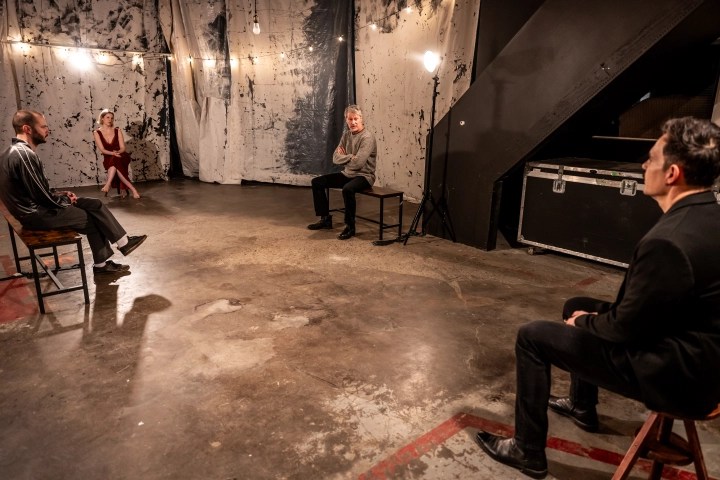 John moves with nervous stealth around the space, from one faraway end to the other, jumping in and out of the rectangular ring with his different loves. The war of desire is on, and he is paralysed, and sometimes annoyingly silent, by this surprising twist of attraction and his inability to see his way forward. They both demand a decision, and he gives them what they ask for when they ask for it, but as soon as the next match resumes, the game and decision shift. Is he a perpetual pleaser of whoever is before him? Most definitely, and as frustrating as it is to all that surround him, the dilemma is forever real and honestly confusing. The dialogue, as written by Mike Bartlett (King Charles III), is sharp and direct, with characters pinpointing the problems with clarity. “You needed to be stronger,” John is told, but he is never quite sure what it is he truly and ultimately wants. And what does strength have to do with it all, he wonders. While also agreeing with the statement. “Am I going to miss his cock, twitching, throbbing?” John just doesn’t know, stating empathetically that he sees himself as two unique personas, different with each, yet pulled by the other. The shift doesn’t really come off as authentically as it needs to be, but the emotionality that hangs in the echoing air does bring forth some level of clarity and insight.
