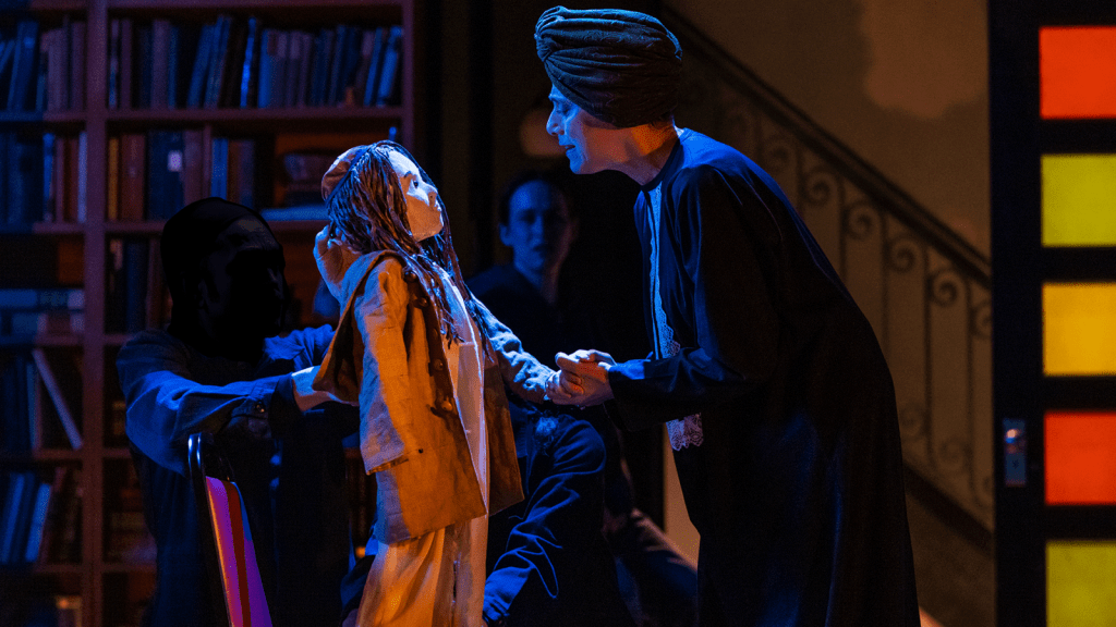 The historical backward-looking scenes play out in chronological order, showcasing, using different puppets to show the growth and intellectual advancement of Chava, from crying about the loss of her hair, to staring over with yearning at her mother lighting the candles for the Shabbat, while her father tries to teach her about manly subjects like prayer and development. Most carry a huge emotional weight, to varying degrees. There’s the sweetest of engagements between Chava and her yeshiva study partner/friend, Chesky, played beautifully by Rad Pereira (-), who also shares a fascination for some of the more complicated androgynous text, before sharing their first emotionally true kiss. But quickly, in the subsequent scene, that connectivity is taken away from them, as he is sent off to get married in Toronto. The loss is heavy and haunting, but it is as expected, as Chava knows the same will be expected of them soon enough.