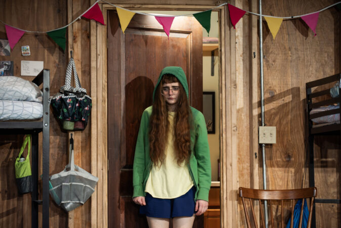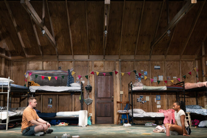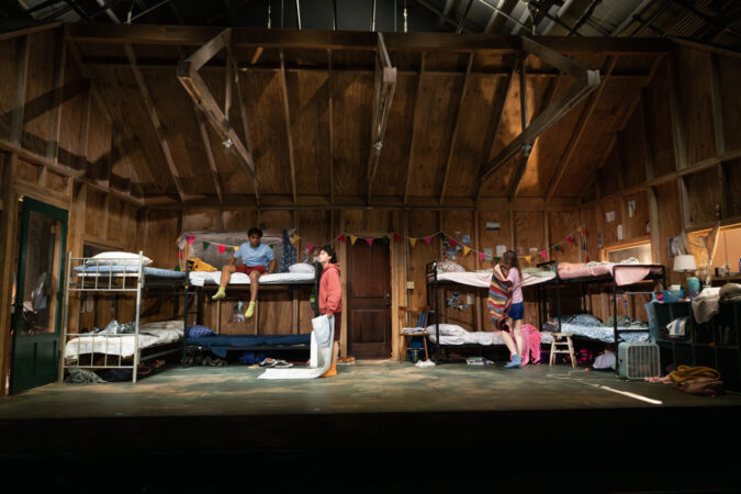 She enters and sits, staring into the wooden camp cabin space with a blankness that registers. She curls herself up into a pajama ball, leaning on one of the four occupied bunk beds that suggest so much, right before they all file in and crawl into their assigned beds, trying to get some sleep on a cool summer’s night in the woods. Atlantic Theater Company‘s Grief Camp, written with thoughtful, intuitive composure by Eliya Smith, looks exactly as you would imagine summer camp to be, if you had ever gone, but this is not like most. Directed with a gentle hand by Les Waters (Broadway’s Dana H.), these teenagers, dutifully embodied by a cast of engaging young actors, are all processing and dealing with death and bereavement, in their own particular manner. It’s vague, a bit surreal, oddly banal, and fascinatingly connecting, as it snaps us awake from stress dreams with the need to pee or with a bugle trumpeting that breakfast is being served “now!”.