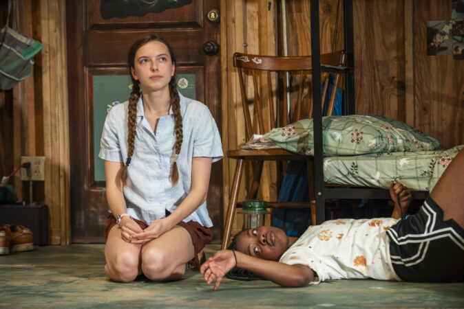 Luna and Ester, played authentically by Grace Brennan (“Pet Shop Days“) and Lark White (RT’s Covenant), pull themselves in toward one another in friendship but also in need. Still, the beauty of these two, and the play itself, is that it doesn’t stall around the idea of loss or sadness. It lets their grief buzz around them like the flies and mosquitoes we imagine crawling and flying around that cabin space, designed impeccably by Louisa Thompson (Signature’s In the Blood), with matching costumes by Oana Botez (Public’s Good Bones), distinct lighting by Isabella Byrd (Public’s Glass. Kill. What If If Only. Imp.), and exacting sound by Bray Poor (MTC’s Dakar 2000), without drawing blood in obvious ways. It’s almost banal in the way it hangs around, shifting and transforming, mutating itself into the repetition of each day as they hold on to their internal processing while existing in actions like reading, writing, and jokes told in the night.