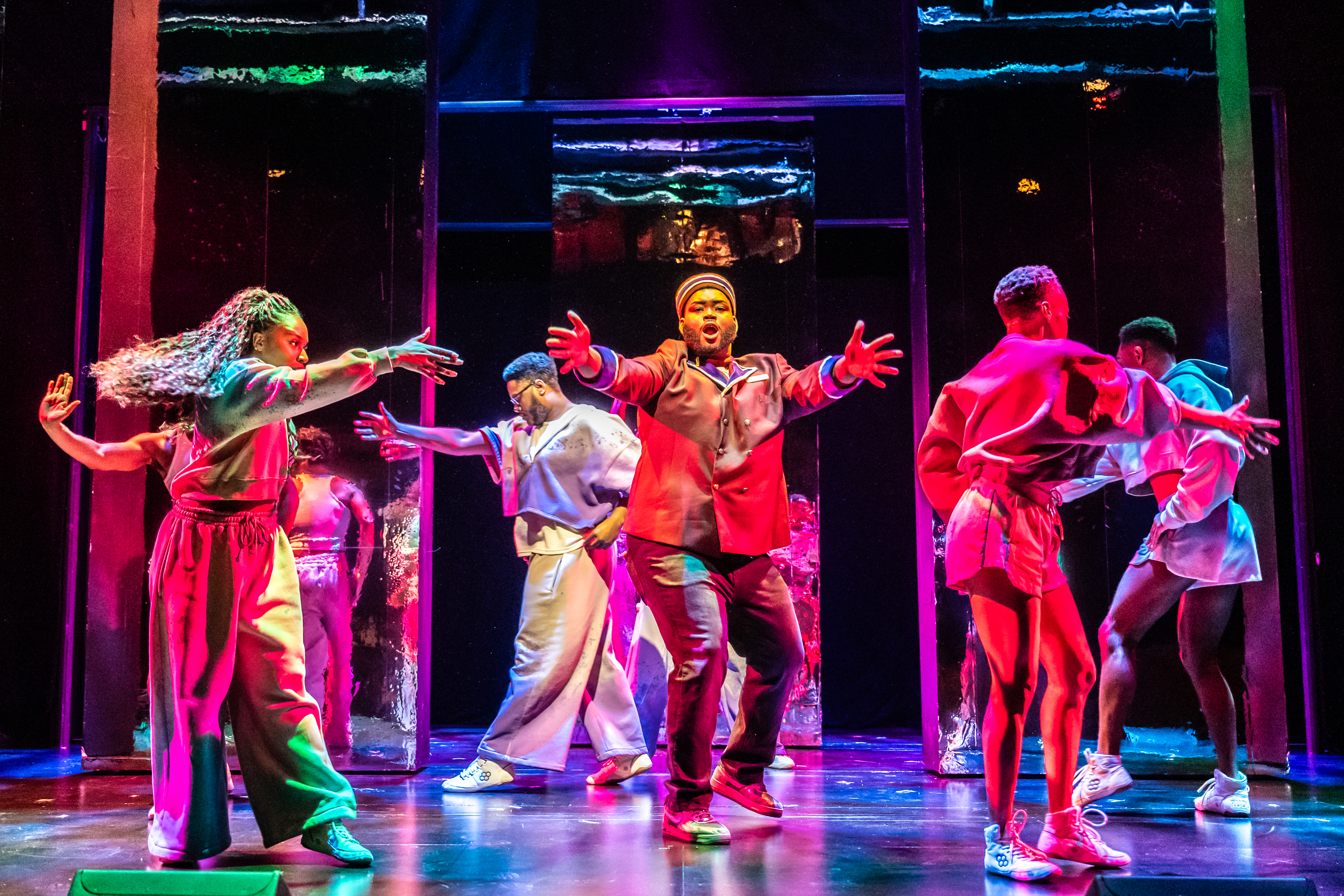 Malachi McCaskill (NC Theatre’s Elf The Musical) as the central figure, Usher, is a three-pronged stab into our funny bone, making us laugh, smile, and wince, especially when he coaxes us to feel the sting of all the different aspects of his loops and his name. His voice is full of raw truth and the clarity of emotion, while never sounding typical or just plain lovely. Sometimes it feels forced or fragile, but it is his unapologetic story that unfolds before our wide eyes, tinted with tones of Rent and Sondheim, that unwraps in the company of his wild and inappropriately appropriate six personified thoughts, each one a gold mine in their delightful descent down the aisel and the rabbit hole of his mind. They are portrayed with finesse and fun by a band of well formed ideals, embodied by the spirited crew that includes: Sierra Holder (Theatre Calgary’s Beaches) as Thought 1; Nathanael Judah (Shaw’s Gypsy) as thought 5; Marcus Nance (Stratford’s Frankenstein Revived) as Thought 6; Matt Nethersole (Shaw’s Brigadoon) as Thought 3; David Andrew Reid (Stratford’s La Cage aux Folles) as Thought 4; and Amaka Umeh (Soulpepper’s Three Sisters) as Thought 2; with each giving us a tightly nuanced slice of their particular corner of the negative core belief structure, even when they might be playing up the formulation with a bit too strong of a snap.
