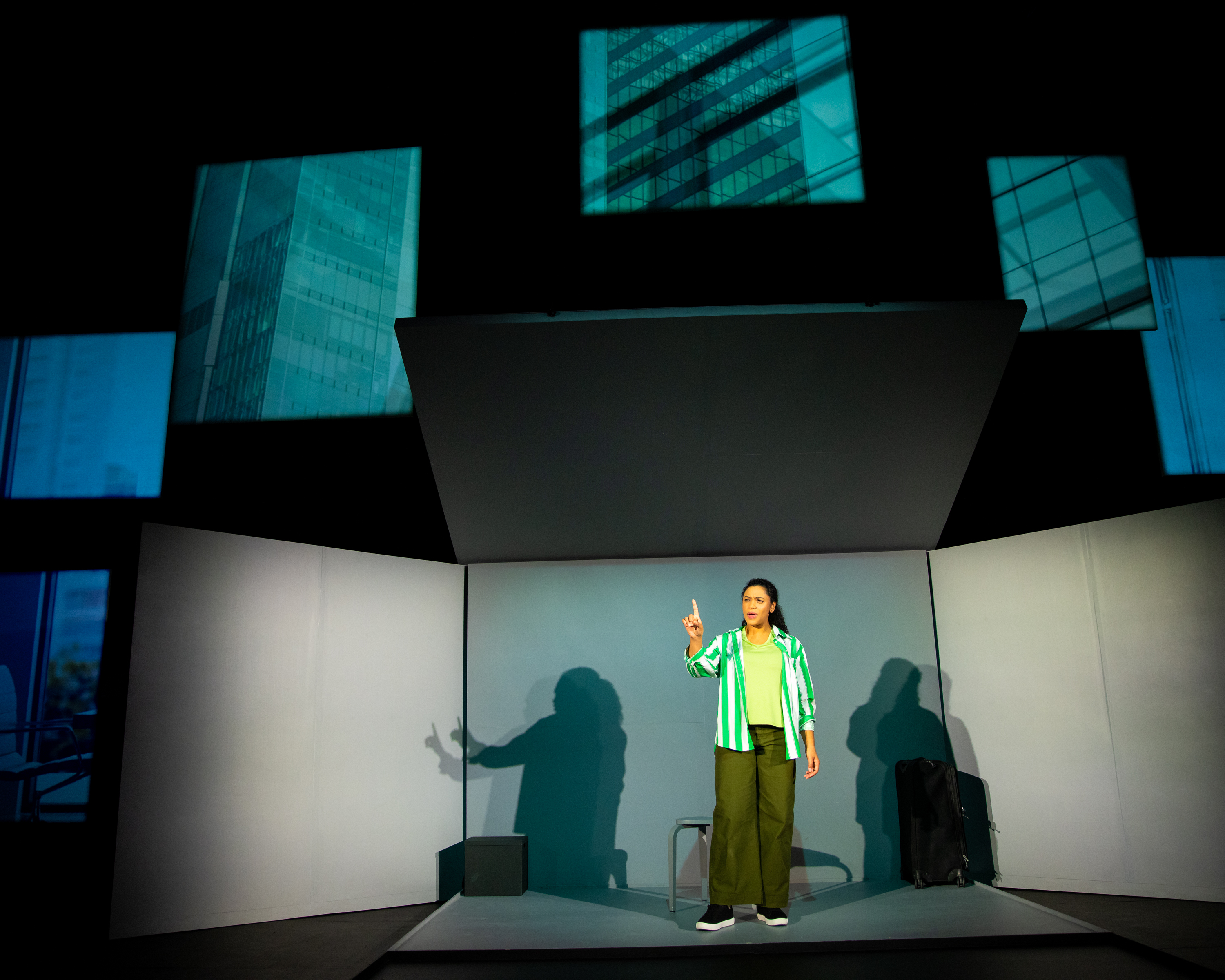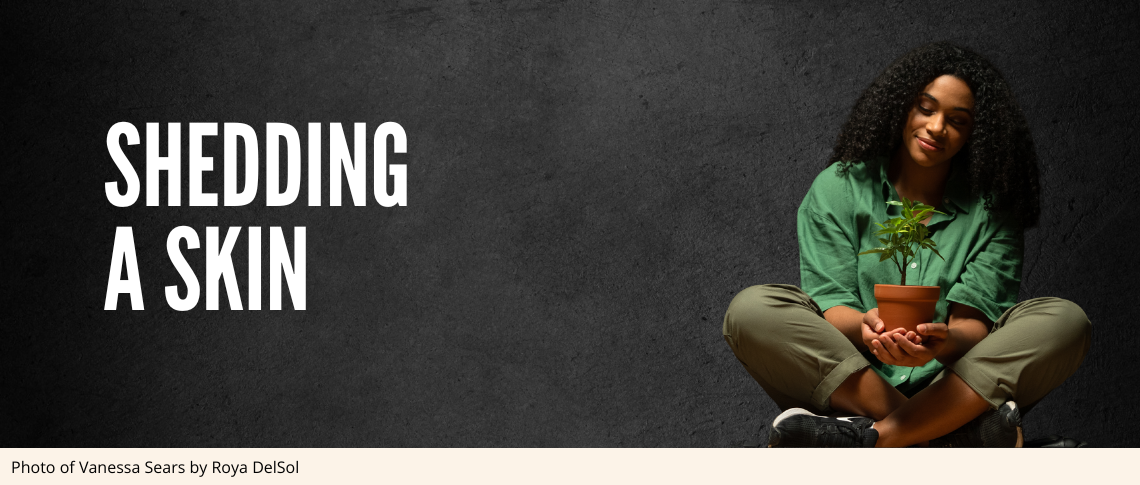 I would rather be anywhere. Anywhere else in the world, right now. Then right here.” A telling beginning to an incredible creation, as we crawl in and engage with the uncomfortable confinement of Myah, played to heartbreaking relevance by the wonderfully gifted Vanessa Sears (Obsidian/CS’s Is God Is). She sits, boxed and diminished inside a white rectangular space that looks like it could be closed up and stored away in the back of someone’s closet, like a pair of old shoes that we aren’t wanting to wear but not ready to throw away just yet. It’s not clear why, at first, inside Amanda Wilkin’s captivating one-person play, Shedding a Skin, as she presents like she has it under control, but we also know not to fully buy into her assurances. And we are intrigued by this complex figure, leaning into a person who seems to want to be invisible within her work cubicle, eating leaves for lunch, and trying, without much desire, to fit into the social norms of the workplace formula. But it also doesn’t appear to sit well on her skin, as she is also working, simultaneously, to resist all those office hypocrisies and posturings.