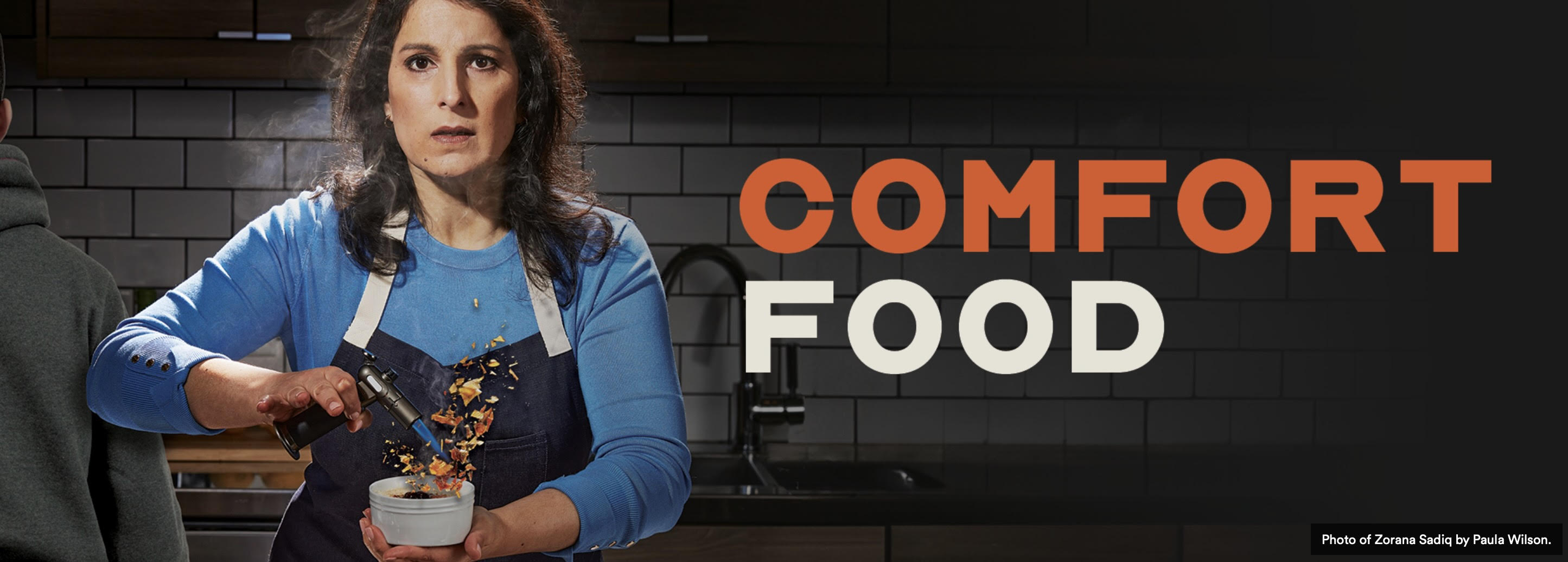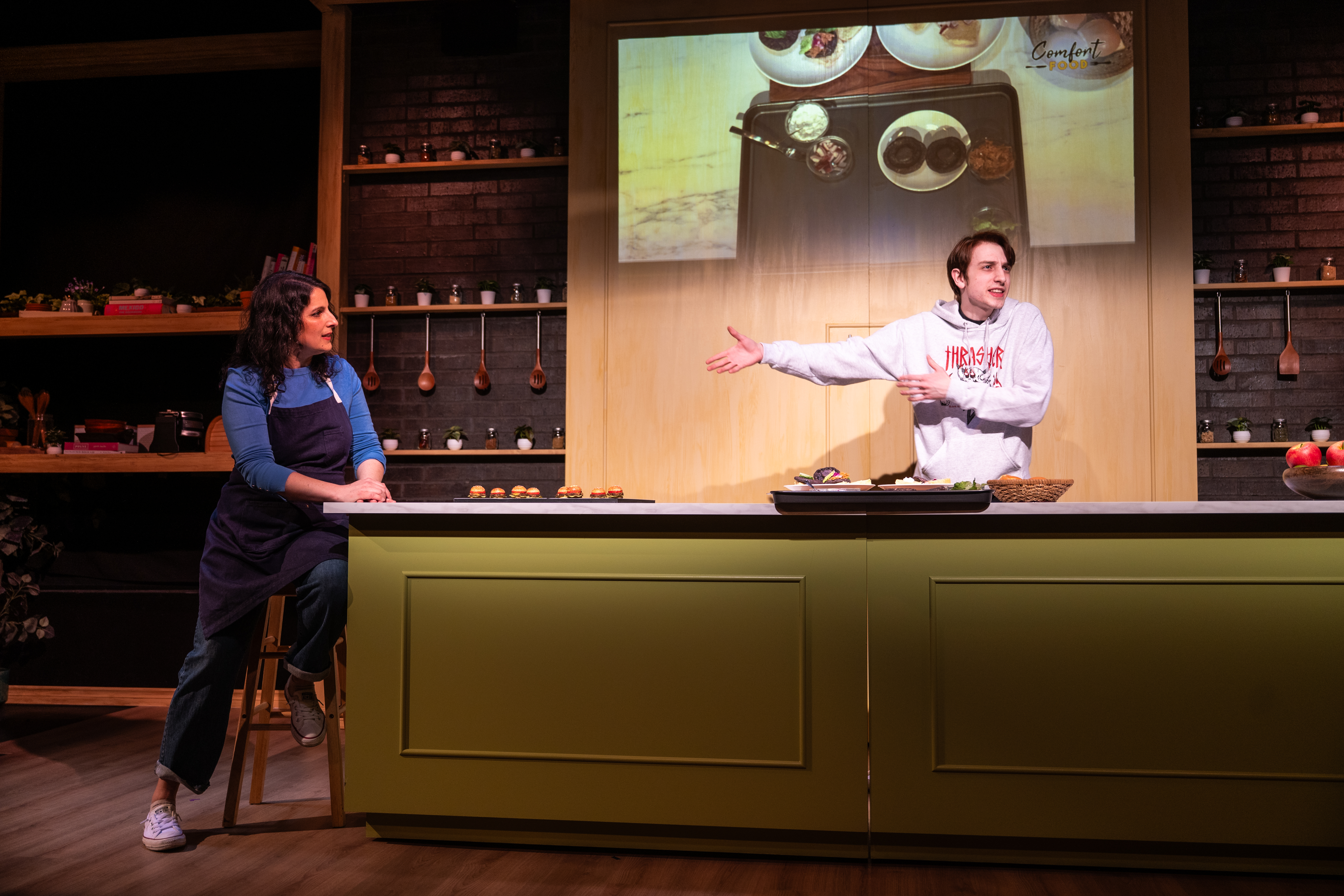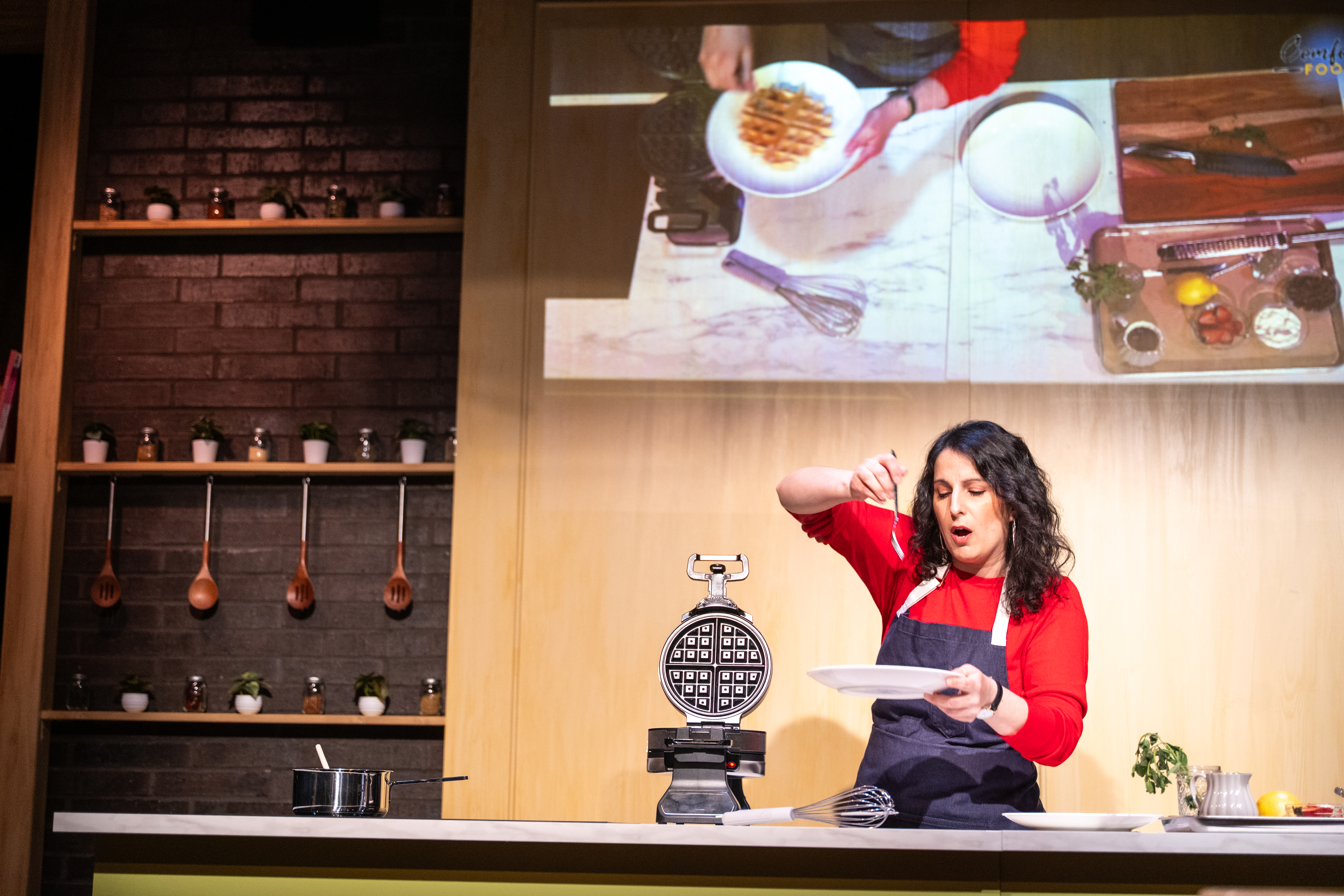 Messily making Belgian waffles for the lazy Saturday morning kids and adults, one with a stereotypically sweet homey chocolate smile and the other with a more complex mature stew of fruit, a framing of the generational divide and cultural war is plated almost immediately within Comfort Food, a new play by the lead star, Zorana Sadiq (Factory’s Armadillos). The title is also the name of Bette’s television cooking show, and although it is meant to feel cozy and connective, the air is sharp with some other form of electricity. After diligently transforming Crow’s smaller studio theatre into a television studio kitchen, lit authentically by Echo Zhou 周芷會 (Stratford’s Cymbeline) with a solid sound design by Thomas Ryder Payne (Crow’s Wights) and a sharp video design by Tori Morrison (Factory’s I Don’t Even Miss You), the framing sits cleverly true, although something about Sadiq’s Bette feels off. We, her now captive studio audience, clap and smile along as she produces the segment with an anxious, brittle edge, filled with pauses for corrective suggestions fed into her earpiece from an unseen producer. She seems like a host on the edge of a sharp cliff, nervous that she’s going to be nudged off, but pretending with all her might to act casual and cook with comfort.