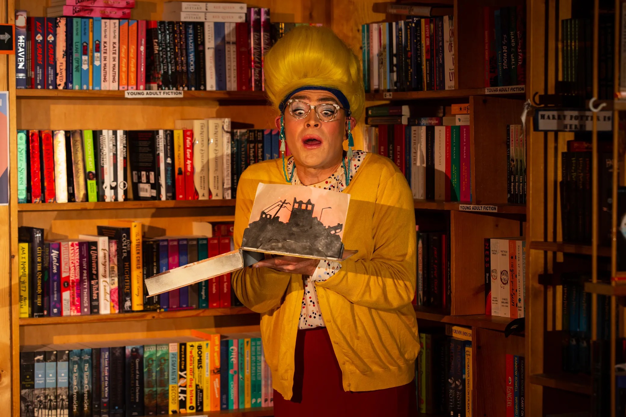 She rolls out with childlike energy and a kick. A high head of yellow hair that defies description, squeaking and accentuating the positive, as Lynn, the lovable, bookish librarian, or as she prefers to call herself, The Libravian, embarks on a nervously engaging journey through the loving connection to literature, books, writing, and reading. Lynn, as portrayed most hilariously by the very agile James Riordan, finds enormous pleasure in the world of books, but she’d rather remain in the background of the library, happily minding her own business, reshelving books and dreaming of the next tale that she will herself write.