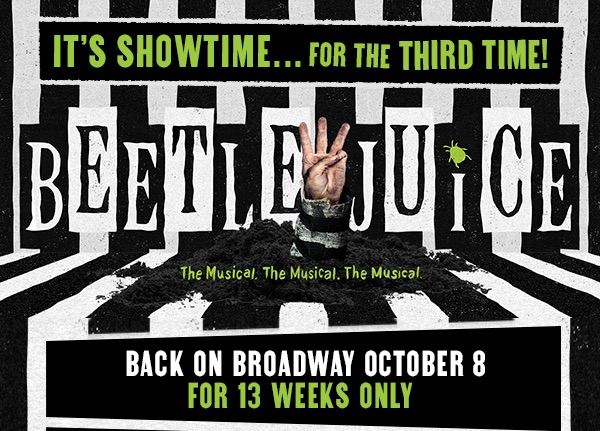 I guess the third time is a charm for Beetlejuice The Musical, which will return to Broadway when the First National Tour of the international hit musical comedy begins performances on Wednesday, October 8, at The Palace Theatre for thirteen weeks only.