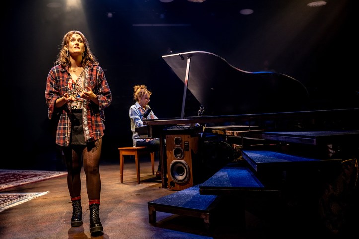 “Give it up for my family,” our heroine, Suzie, played dynamically by the very gifted and engaging Annika Tupper (The Maker’s An Incomplete List of All the Things…), cries, giving us a clear window into what her world is centered around; her parents and their famous stance, “Canadian famous,” she corrects herself, which speaks volumes of all that she is engaged with. Her parents, the dynamic Jean Stone and Ashley Evans, played magnificently by Deborah Hay (Stratford’s London Assurance) and Andrew Penner (Crow’s The Shape of Home…), have created a world of rythym and rock music complexities, etched in the detailed and delicious sounds made famous by the song writings of her rock star parents and their eclectic and endearing band members: drummer JD Kunkel, portrayed adorably by Joe (Jojo) Bowden (Soulpepper’s The Big Easy), and guitarist Mickey Mintz, played winningly by Brandon McGibbon (Tarragon’s Hamlet), each side stepping the difficult situations expertly and wisely.