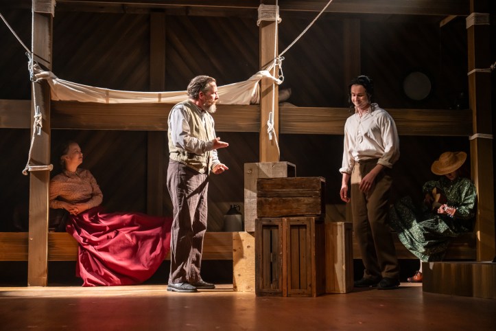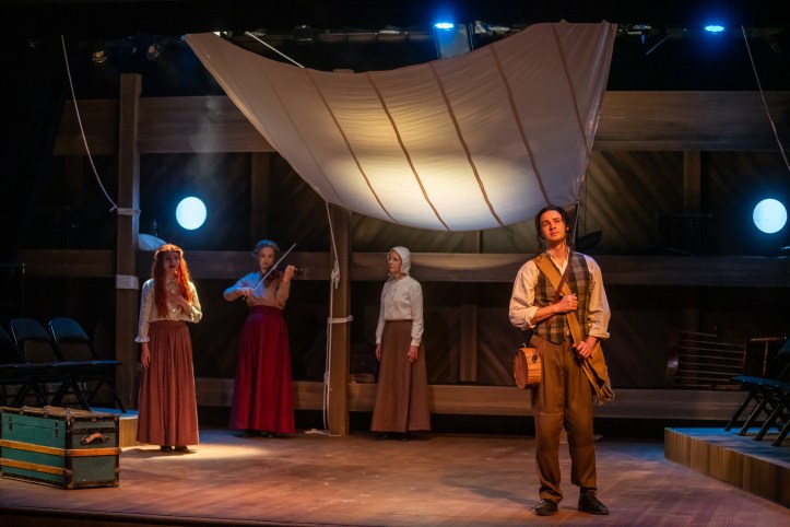 Boarding the ship of dreamers and sea-sick fools, some might say, including Jane’s parents, the determined young Henry strives forward, even as the settled folk call him a suspicious “ship-rat,” and a drunken beggar. Yet, he forges forward with three pieces of insurance and a letter of recommendation in his pocket. And we are right there with him, as The Wind Coming Over the Sea throws everything hard and difficult at him from the moment he steps on board. It’s a caringly well told crossing on that ship bound for this new land and his first winter in Canada, beautifully engraved in the solid, flexible staging courtesy of the inventive creative team of set and lighting designer Ken MacKenzie (Soulpepper/Signature’s Kim’s Convenience), costuming by Meghan Choma (Asst/Grand’s Pride & Prejudice), and a solid sound design by Adam Campbell (Assoc/Tarragon’s After the Rain), that registers on all levels from beginning to end.