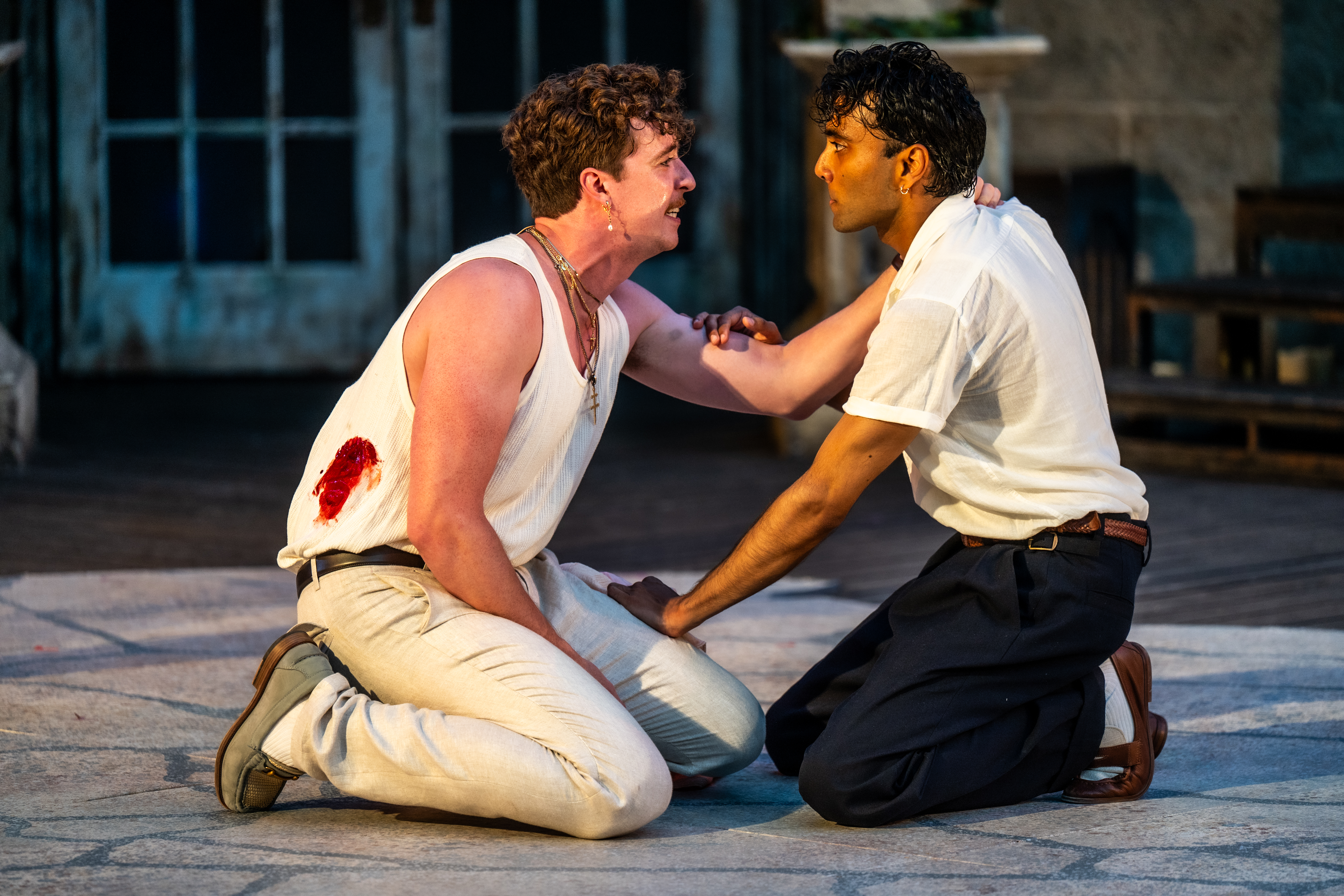 There was also some hope in Farsi’s determination to set this tragic play outdoors, surrounded by all this beauty, yet, with the threat of rising fascism hanging in the air and within its historic sidelines. But the thematic ties to that turbulent era—its rise of fascism, its shadow over love and hate—feel faint, as if the storm outside is just a whisper of something rather than a thunderclap. The rivalry, once deep and rooted in history, feels simplified, like a scratch on the surface of a more profound conflict waiting to emerge. The promise of political resonance, though tantalizing, floats just out of reach in the dark clouds, leaving the unfolding tragedy feeling somewhat disconnected from its setting and its impulse. The aesthetic is all there, beautifully carved out by set and costume designer Suzer, evoking the 1930s Italian summer, and hinting at treacherous currents beneath the surface. But the underlying thematic reasoning and energy don’t seem to radiate out a strong rationale for this timing. And removing the Montague parents and what they stand for in this feud between families doesn’t help the situation. It leads to an off-balanced rivalry that minimizes rather than expands or expedites the fight.
