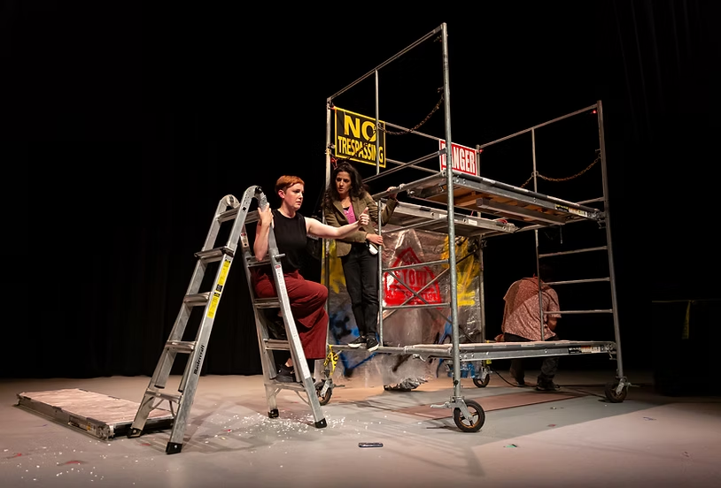 Roped and clipped onto the same towering structure—metaphorically constructed by playwright and director Alexa Higgins (Don’t Look Down’s SIBS)—Jane, played flawlessly by Higgins, navigates the play’s fast-paced, fierce formula, jumping back and forth to unpack her untethered story that doesn’t make sense to those looking up at her. Yet, curled up and climbing like an animal being chased up to the top, Jane seems to know her stance, even as she finds herself stuck in that tight spot high above the crowd. You’re causing “quite the stir,” she is told by the one, also damaged, who is trying to help her, by trying to understand her. She’s caught, in a way, between that symbolic rock and a hard place, but high up in the sky in a metal cage that is giving her a freeing vantage point to survey the horizon.