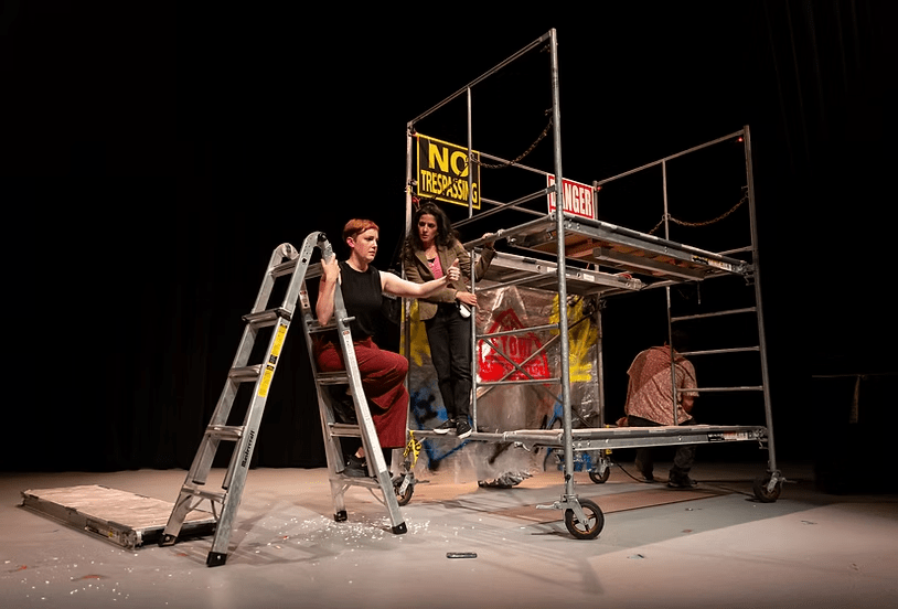 Inspired by the real 2017 incident in Toronto, when a woman climbed a crane almost 100 metres high, the play is a fast-paced climb, working diligently to try to comprehend her pain through its sharply funny physicality. It’s an intensely personal contemplation of a young woman’s anger and rage against the confines of her own body and her ownership of her reproductive rights as a woman, a friend, a wife, and a possible future mom, all played out high up in the dark clouds. Navigating the metal bars and the patriarchal nightmare of a modern woman’s existence, Crane Girl delivers with the roped-in dynamic assistance from her fellow actors: Ian Ottis Goff (Don’t Look Down’s Skyline) and Katherine Cappellacci (Theatre By Committee’s Wagon Play). The play, and its crew, never lets Jane step down, literally, keeping her character and her battle suspended on that crane for the entirety of the show. The three actors move about the space, navigating most magnificently the metal structure like it’s a fourth character, giving it unpredictable and unprecedented character development in its restructuring, like the wires, pathways, and formulations that exist in our traumatized brain.