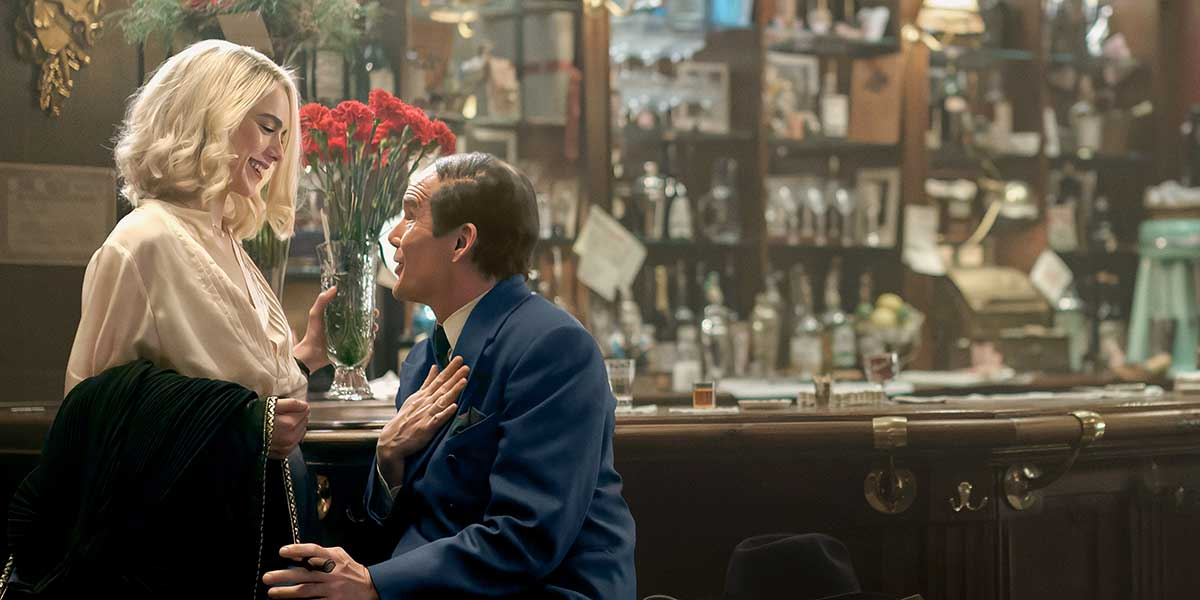 The film is a finely-tuned, close-quarters exploration of the lost and lonely Hart, set on the opening night of the musical Oklahoma!, with an emphasis on the exclamation point. We sit with the semi-closeted Hart, in real time, at the legendary Sardi’s, after he slips out before the applause can overtake both the theatre and his ego. “Am I bitter?” he asks. “Yes“, holding court at the bar like only Hart can. It’s an intoxicating moment to slip into, as we witness him engaging in sharp banter with the wise and straightforward bartender (a perfect Bobby Cannavale), a young aspiring composer and military officer (Jonah Lees) forever playing piano on request, and the elegant essayist, E.B. White (a fascinating Patrick Kennedy), trading words and slices of wisdom with Hart. Wearing a balding wig and delivering his lesser stature somewhat awkwardly, Hart speaks with the fervor of a young man, claiming love for his current adoration, a 20-year-old Yale student, Elizabeth Weiland (Margaret Qualley), while fully acknowledging his tendency towards homosexuality and balancing that idea as if it were reasonable and honest.