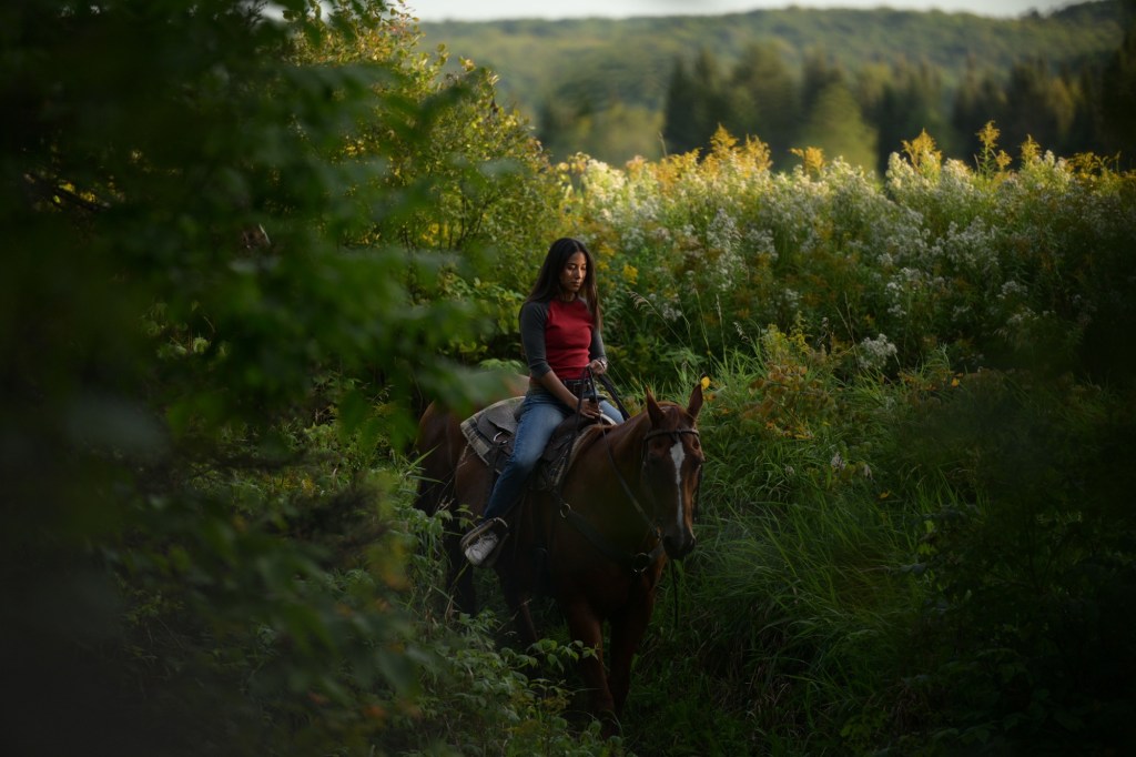 Centering the action around an upcoming Métis Day festival, a small town reporter and store clerk, Beatrice, played marvelously honest and earthbound by Dana Solomon, is quickly smitten by a young woman who arrives in her Métis community hoping to find her biological family while also working as a horseback riding guide locally. Beatrice dons her reporter’s cap to engage with Chani, played organically by Derica Lafrance, and tries to help her find her biological mother. But it’s really about finding the opportunity to spend time with the young woman. We feel their chemistry almost from the get-go, even if Lafrance’s first interactions with the reporter come off a touch abrupt or caustic.