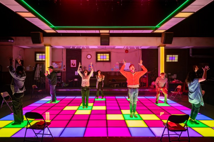 Alicia Ault, Andrew Broderick, Giles Tomkins, Damien Atkins, Hailey Gillis, Ben Carlson, and Zorana Sadiq in Octet. Photo by Dahlia Katz.