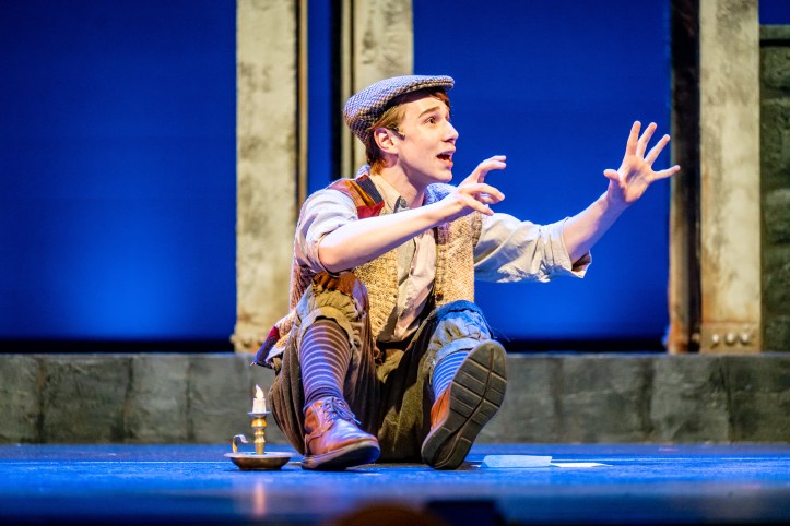 These young performers excel in their well-formed leading roles, bringing heart and passion to both their vocals and their character work. Yet, for me, the emotional core of the show lies truly in Leland Chafee’s tender turn as ‘Crutchie‘. His Act II moment — sing-writing a letter to Jack from the Refuge describing its dangerous, filthy, and abusive conditions — is moving and gentle as he intones the touching “Letter from the Refuge.” Delivered with understated honesty, it’s a performance that emotionally connects as Crutchie pleads for the newsies to keep looking out for one another, signing off simply: “your brother, Crutchie.”