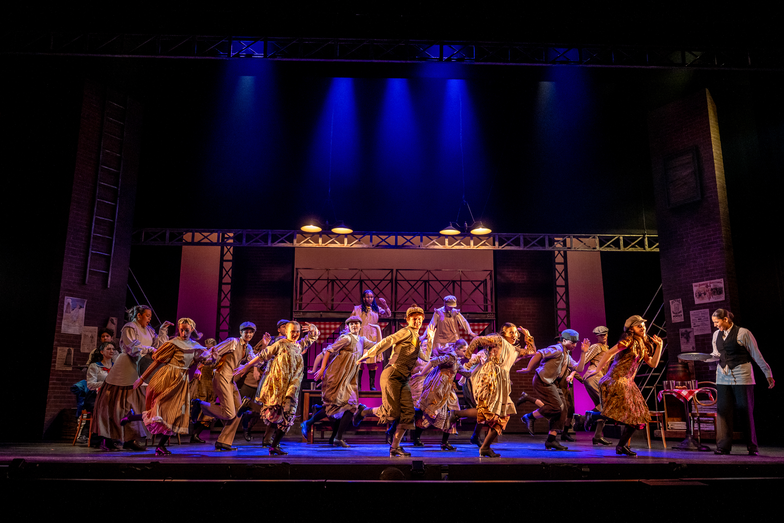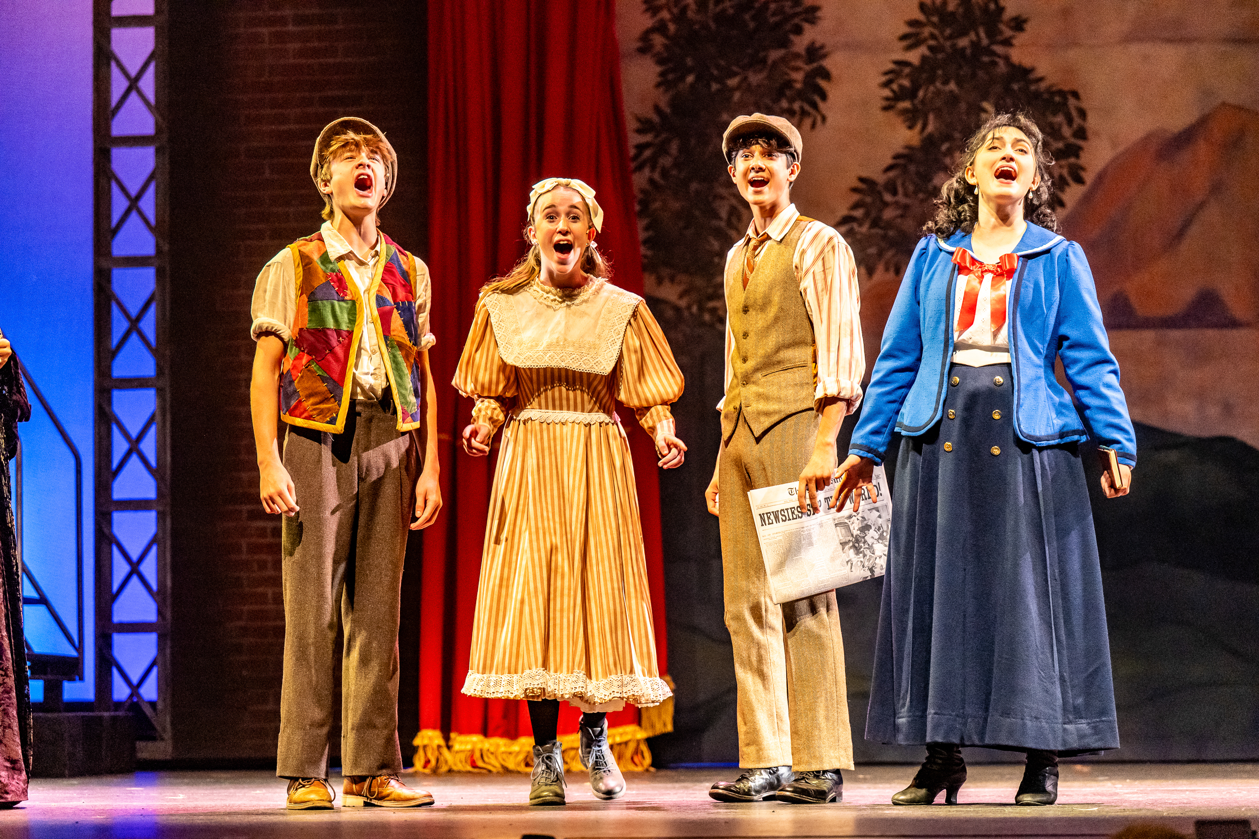 Their showstopper “King of New York“, led by a smooth, magnetic Desi vanBeek-Paterson as Newsie Race, assisted by, among others, the feisty Hayden Baertsoen as Romeo, is a true highlight — the kind of big, polished number that makes you forget you’re watching high-schoolers rather than seasoned professionals. The show itself also feels timely and resonant, its themes of justice and solidarity echoing the world around us today — a perfect fit for a cast and crew of high school students to dig (and tap) their theatre-loving souls into. Based on the 1992 Disney movie starring Christian Bale, Bill Pullman, and Ann-Margret, Newsies charges headstrong into the real-life Newsboys Strike of 1899 in New York City. It comes out swinging, finding a solid grounding to play out this history on that wide Grand Theatre stage, thanks to the vibrant energy of these young singers, dancers, and performers.