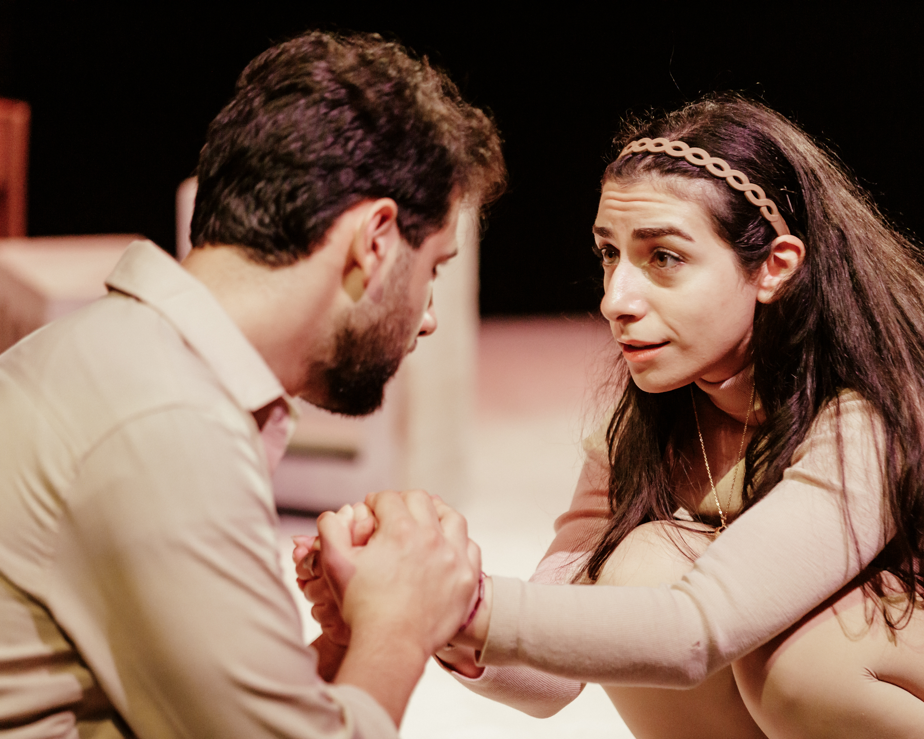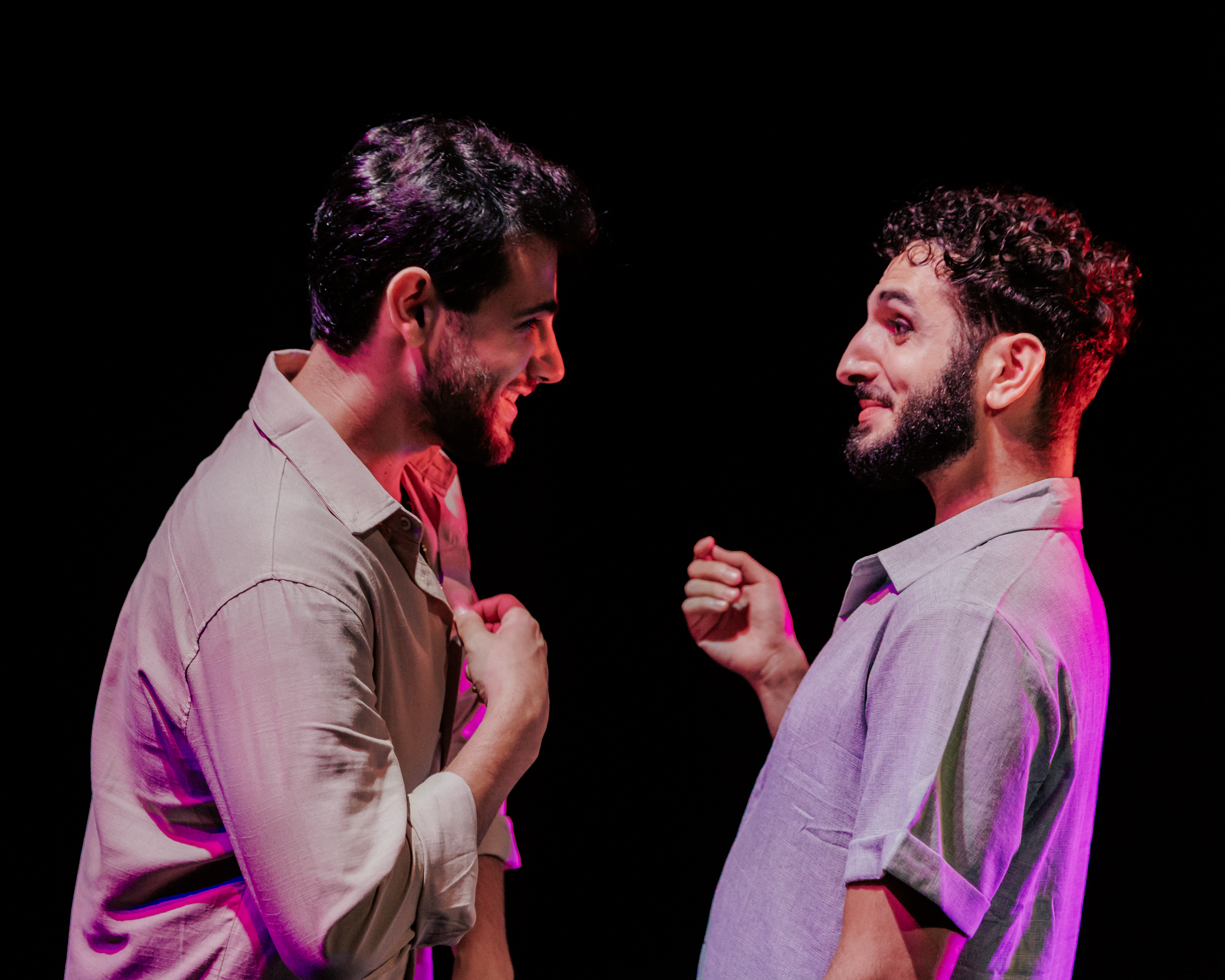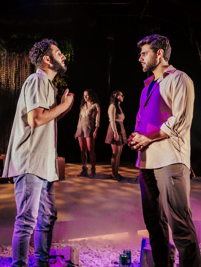 “For a place full of war, its surprisingly fun,” a young man says to a drag performer fresh from the stage. It’s not what he expected in Beirut, nor did I, but as these two men, portrayed compassionately by Oshen Aoun (NTSC’s Richard III) as Naseeb/Rami and Waseem Alzer (off-Broadway’s On That Day in Amsterdam) as Fifi/Zidan, a more contemporary, nightlife-infused Beirut comes into focus. But as the drinks are poured and the façades fall away, their dynamic reveals a yearning no less urgent than that of Yara and Mona. This storyline, bedazzled at first in cultural distraction, peels back to show its own vulnerable undercurrents of intimacy and survival. Aoun, navigating the dualities of Naseeb/Rami with authentic force and tenderness, and Alzer, balancing glamour with gravity, ground their scenes in a palpable ache. Yet we feel for all four as we try to piece together the broken pieces from the (somewhat unnecessary) rubble on the stage.