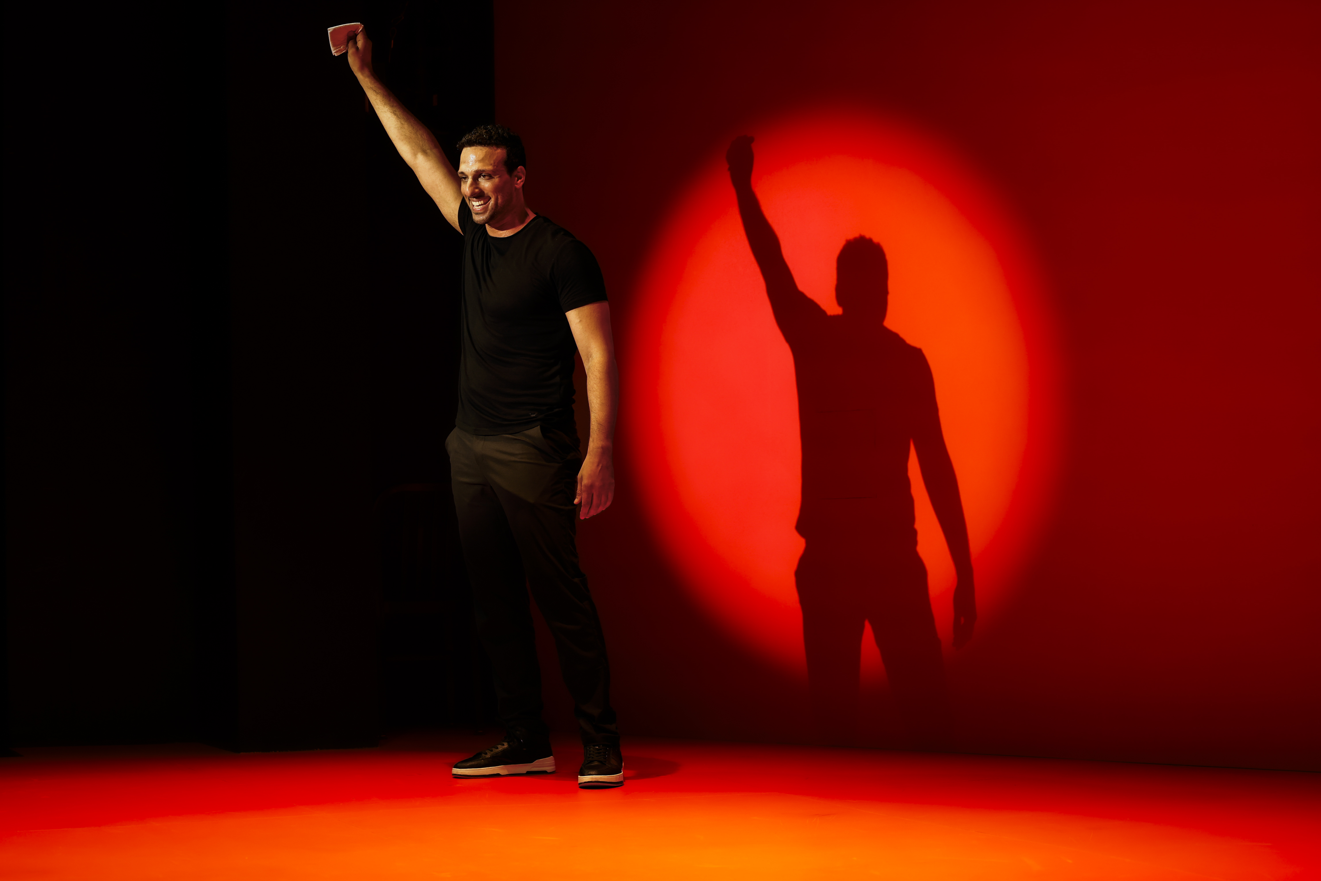 Unwinding at full velocity with the Tony win, the applause, the disbelief, followed quickly by a full-blown panic attack and a bathroom breakdown, Stachel recreates those moments with both the confidence of a performer and the trembling recall of a man whose interior world was unraveling. He embodies a myriad of personas, taking his own arm and leading him into celebration, before the show quickly resets and rewinds. He guides us on his journey via a fast-talking confessional that ricochets through childhood, adolescence, and career, propelled by the controlling voice of “Meredith,” his OCD personified as the coldly perfect antagonist from The Parent Trap. (In one of those odd coincidences that made me laugh in recognition, I once shared an apartment with the actress who played her, making Stachel’s choice even more striking and darkly funny.) His “Meredith” forever stands firm, arms crossed, and demanding, becoming both his fierce tormentor and unwanted companion. Her relentless whisper of doubt and vindictiveness haunts every triumph and personal interaction, from the age of six to now, but the complexities of this piece don’t stop there.