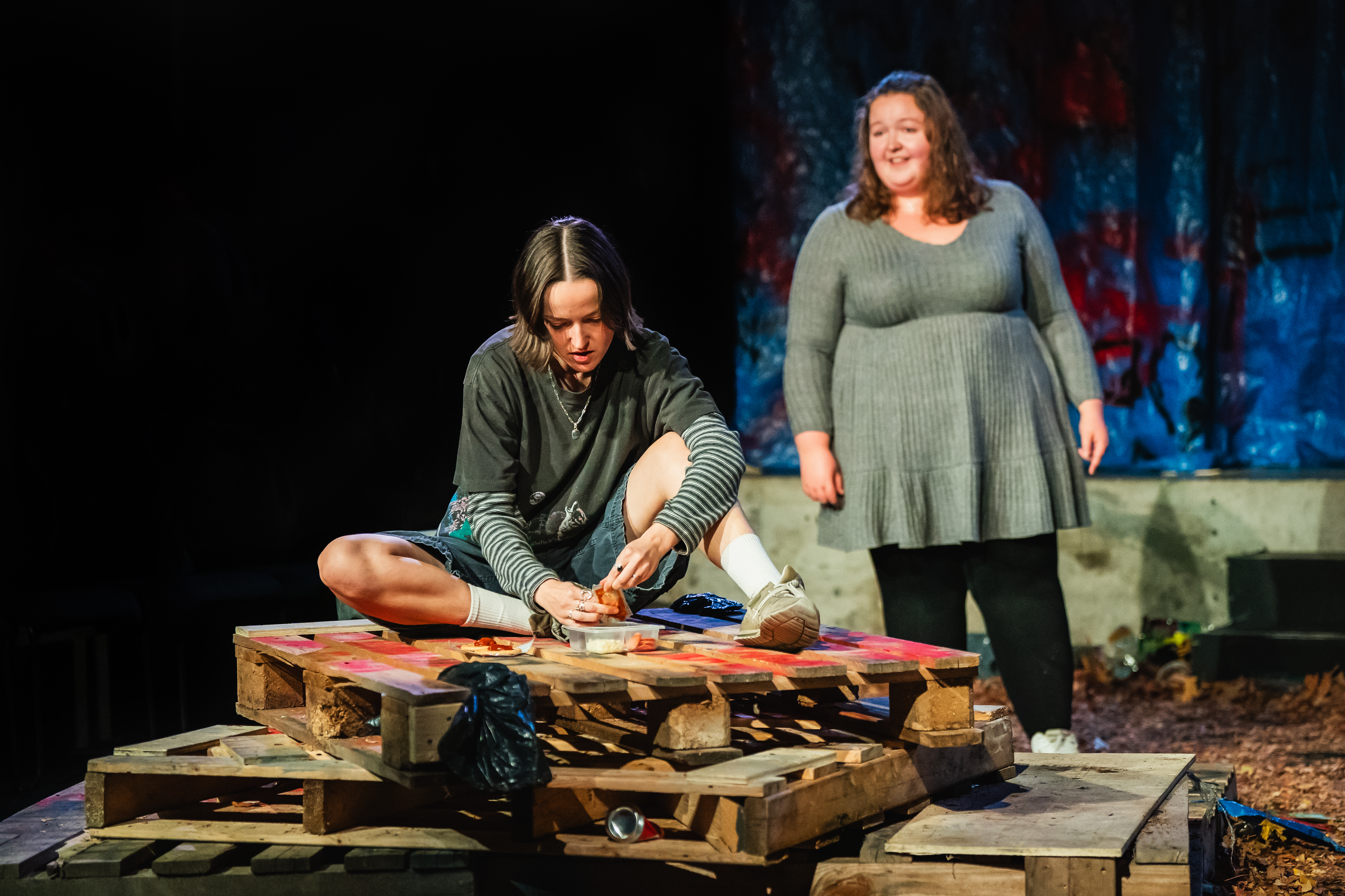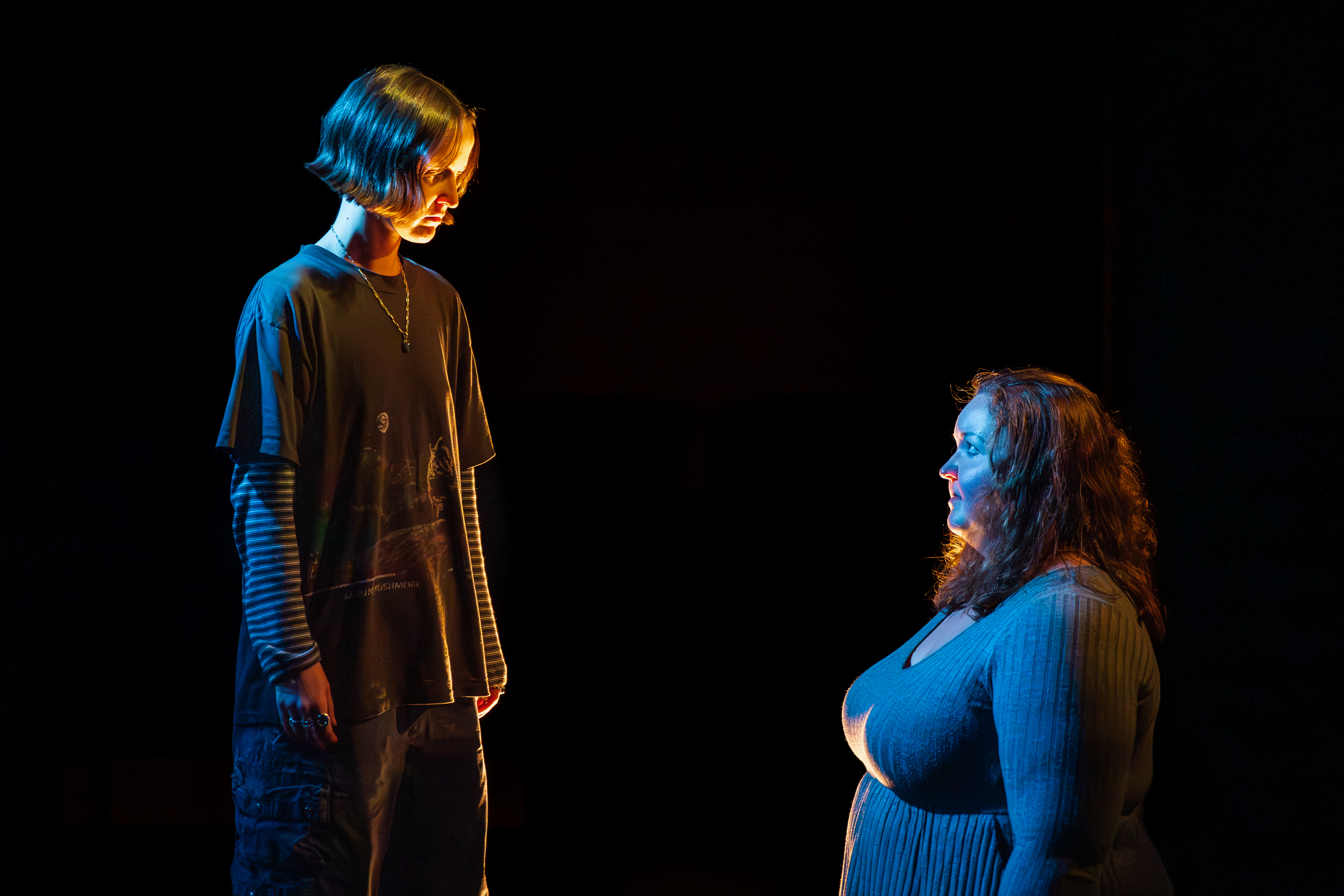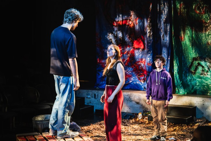 The production’s minimalism heightens its tension. Nic Vincent’s lighting cut sharply through the darkness, evoking both the night of the incident and the lingering, unseen presence that haunts them days and weeks after the event. Some elements that seem of interest, like the plastic container containing Leah’s dead pet (costumes/props by Corcoran), or the hyper-brutalism of John, dead end in the woods, tucked away, never really finding their purpose. But up above, the cumulative effect of their desperately tight, gang-like union is devastating in its simplicity, reminding us of a teenage “Lord of the Flies“, but up on a hill near a school, rather than a remote island in the ocean. Death, here, is never personified, never announced, yet it fills the air with its profound consistency, revealing an invisible, yet devastating consequence that reshapes each of those who were complicit.