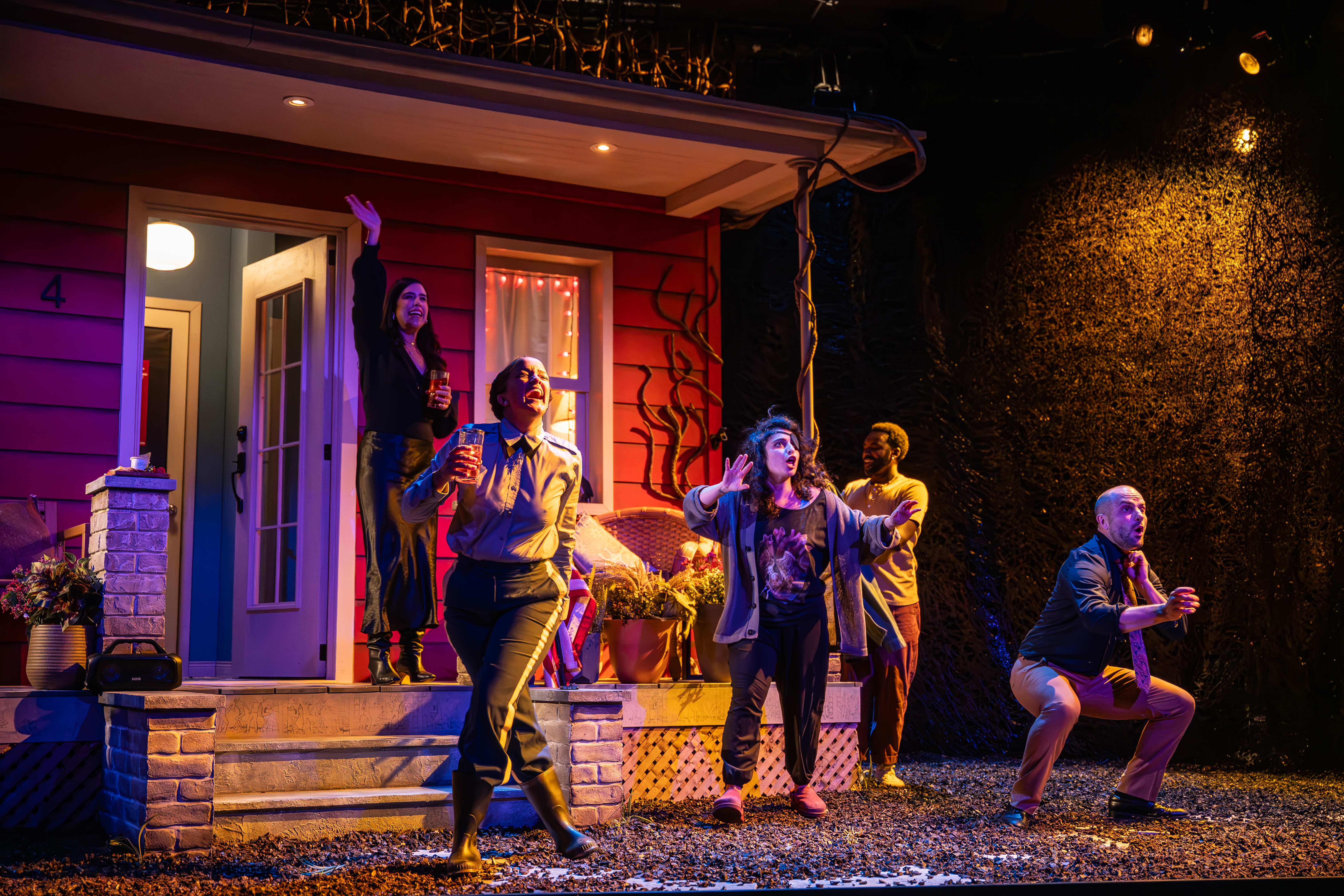 Visually and aurally, The Comeuppance is unified. The porch set, designed by Shannon Lea Doyle (Soulpepper’s The Seagull), feels both familiar and slightly otherworldly, its wood and shadows holding the residue of memory. The costumes, designed by Ming Wong (SP/TMSC/Crow’s Octet), trace the faint absurdities of middle age, while Jason Hand’s lighting hypnotically shifts from warm dusk to spectral glow in an instant. Olivia Wheeler’s sound design deepens the unease, echoing scene transitions into an otherworldly pulse. Together, the design team grounds the play’s metaphysical reach in sensory detail, allowing us to feel death’s curiosity as both threatening and strangely tender.