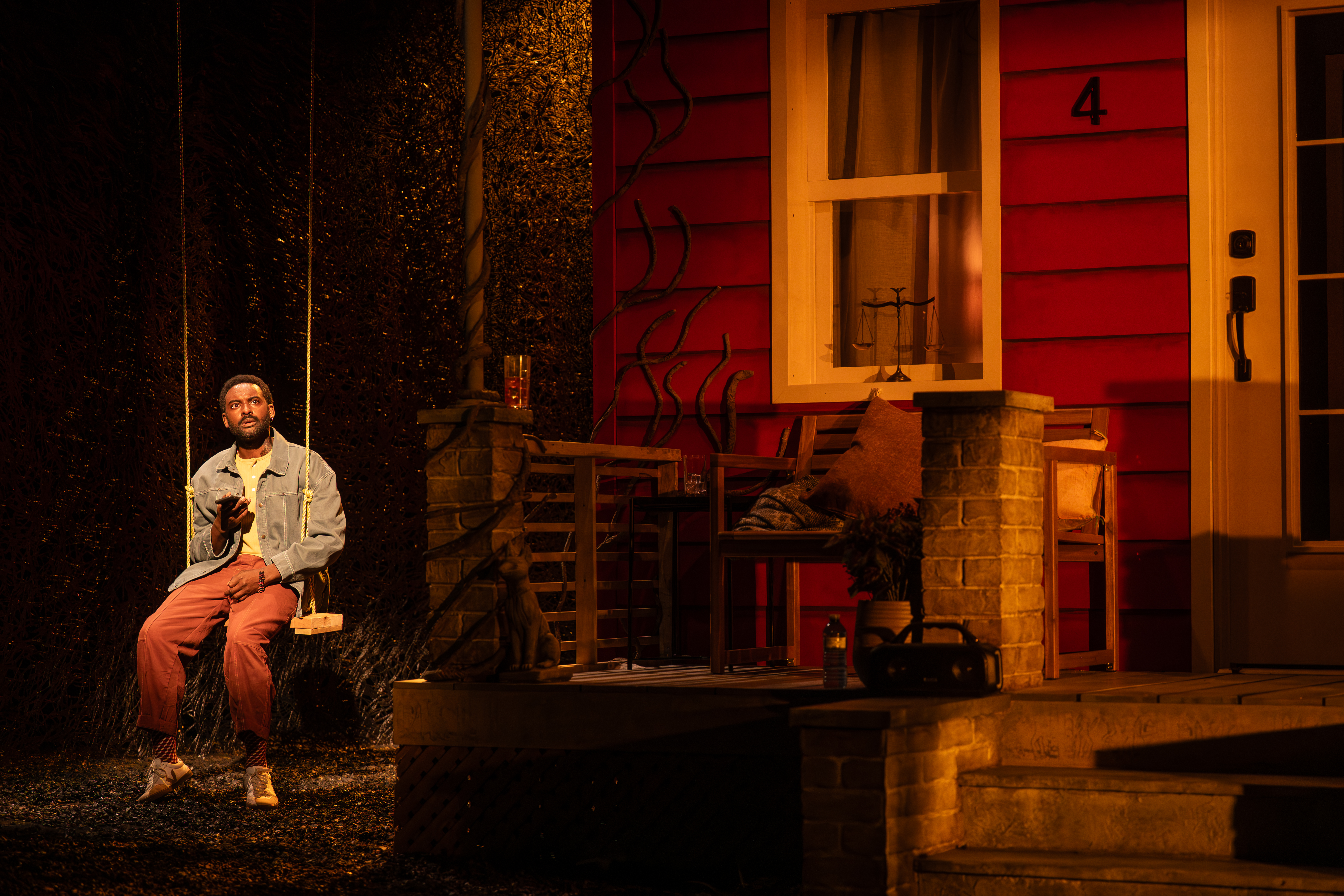 The shocking white face of death, literally, waits in the doorway before the show even begins, its shadowy presence framed by a dim porch light and a swing that creaks like an omen. It’s a chilling and inspired start to Soulpepper’s The Comeuppance, the hauntingly surreal play by Branden Jacobs-Jenkins (Purpose) about old friends, unfinished business, and the inevitability of reckoning. Directed by Frank Cox-O’Connell, this Canadian premiere takes the playwright’s sharp social wit and turns it toward something quieter, more insidious, serving up the question of who we’ve become in the aftermath of loss and isolation, and whether our shared history, watching us like ghosts, is any more forgiving than the ones we carry within.