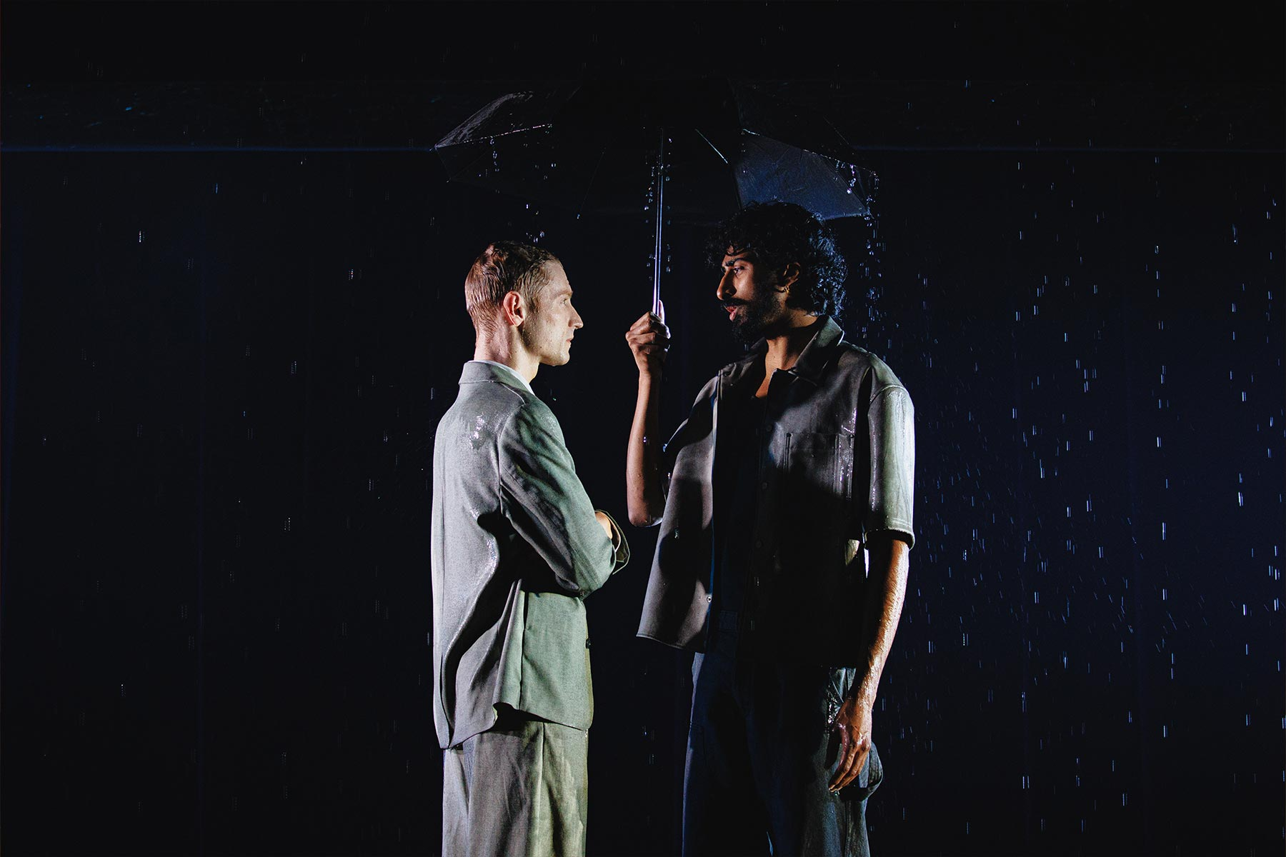 Prince Faggot strides forward, not with a golden crown but an actor’s confession, based on childhood photos seen under a microscope. We’re queering and questioning our heritage and our birthright, as it surprisingly starts as a study, a cheeky anthropological dig into what we dare see in a photograph of a child. Do we see the telltale sign of a lineage, a secret, or a spark? The ensemble stands before us, clearly asking who we were before language, before desire, before gender and queer identity prefigured our expression; before our knowing and acknowledging. And what others thought we would become, should become, or are destined to become. But before it leans too far into the theoretical, director Shayok Misha Chowdhury (Public Obscenities) sweeps us into the glittering fan-fiction at hand: the highly entertaining and torrid reimagining of a modern-day rebellious royal romance between the fantasy, fantastic, young British Prince George and his compelling, sensual lover, Dev.