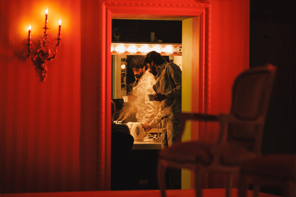 John McCrea (West End’s Everybody’s Talking About Jamie) as Prince George is deliriously sharp; all tight sparkle and simmering rebellion. He’s undaunted and deliberate, while also cautiously caught between duty and desire. Mihir Kumar (Commonwealth Shakespeare’s Cymbeline) as Dev is the fire and the freedom of the framing. As the devoted, at first, boyfriend, he easily becomes one of the most fascinating characters in the play. Dev is both a forceful Dom to his Prince Faggot: “Don’t talk to your Dom that way,” and a well-educated intellectual who easily stands up for himself, even if his views go against what the Royal Family wants from him, and he is absolutely not willing to be just a “friend” from school coming along for the weekend. He is wryly self-assured and deeply sympathetic, even when wildly overwhelmed by the unwanted attention, navigating his own identity while nudging the Prince toward something braver than anything either has ever known. When their guard is dropped for a split camera-ready second, their hands find each other’s on a train platform, and they are instantly caught, and through the dangerous lens of public obsession, their relationship explodes forth. Royalty hasn’t changed, but love has in the public’s eye.