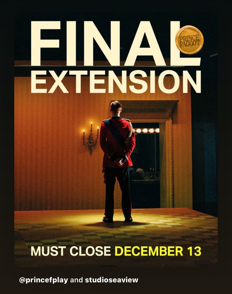 That blurred authorship makes Prince Faggot not simply a play but an astute invitation to consider how we inherit the right to be who we are, royal or otherwise, and to question what it costs when a world built to contain us fails to comprehend us. It’s not perfection, this royal unwrapping, but Prince Faggot is something far more rare. It’s an audacious ritual of reclaiming, stitched with glamor and grit, teetering on its own crown. Many in that house, including myself, will have the desire to return (particularly this Commonwealth Canadian gay man), not to solve the layered puzzle set out before us, but to sink deeper into its thorny, glittering truth. and see something we haven’t noticed before in this particular framing, even if we all saw the signs.
