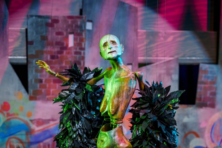 The man behind the puppets certainly knows how to create a world filled with personality and energy, where fantasy and kindness can intersect, at the corner of trouble and change. And Burkett’s wild imagination cracks that pavement open wide. The back alley becomes a stage for a street-poetry slam by the Trash Alley Ensemble that shines a light on resilience and defiance, before we tumble and join a crew of childhood fantasy characters, including a rambunctious gay Saint Nick, an overworked, muscular tooth-fairy working a double shift, and an ethically authentic Jesus shaking it up and cheering on a seductive, feathered Mother Nature performing a celestial cabaret song and dance that is unforgettable.