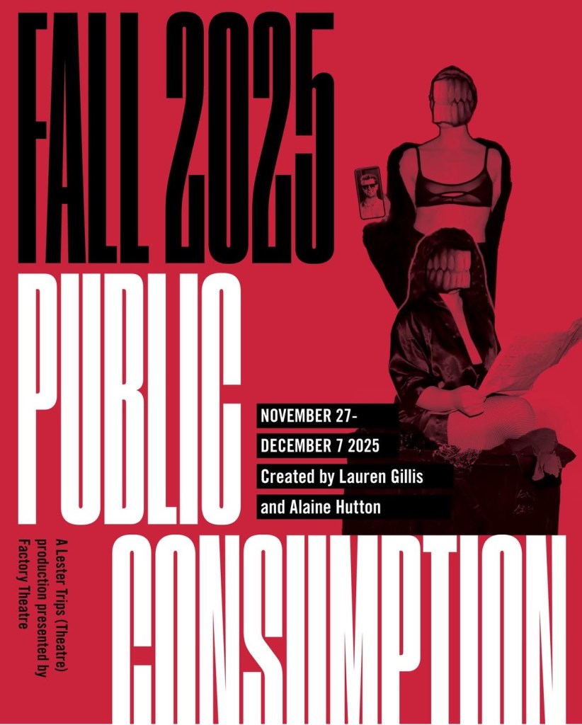 A lone figure stands sealed inside a bright, sharp square of light, their rhythmic, sensual movements unfolding like the first notes of an impending collapse. Framed like a specimen under tight examination, the initial engagement is unsettling, giving us access while keeping a sense of removal, or enclosure firmly in place. The sentencing comes soon after, and as Factory Theatre’s Public Consumption revs its deliberate engines, the hold it exerts becomes hypnotically powerful. Created by Lester Trips (Theatre) with Lauren Gillis and Alaine Hutton (Factory’s Honey I’m Home) as the play’s writers, performers, directors, producers, and designers, this content-warning-laden piece is exactly the kind of theatrical experience that makes you brace yourself before you even know why. It’s compulsively addictive and meticulously constructed: smartly conceived, tonally precise, and performed with an unnerving control that leaves you feeling speechless, but with a lot to say.